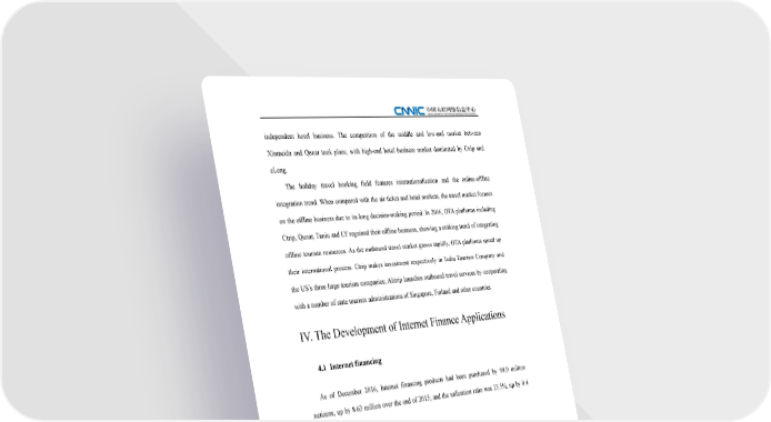 independent hotel business. The competition of the middle and low-end market between Xinmeida and Qunar took place, with high-end hotel business market dominated by Ctrip and eLong. The holiday travel booking field features internationalization and the online-offline integration trend. When compared with the air ticket and hotel markets, the travel market focuses on the offline business due to its long decision-making period. In 2016, OTA platforms including Ctrip, Qunar, Tuniu and LY regained their offline business, showing a striking trend of integrating offline tourism resources. As the outbound travel market grows rapidly, OTA platforms speed up their international process. Ctrip makes investment respectively in India Tourism Company and the US’s three large tourism companies; Alitrip launches outbound travel services by cooperating with a number of state tourism administrations of Singapore, Finland and other countries. IV. The Development of Internet Finance Applications 4.1 Internet financing As of December 2016, Internet financing products had been purchased by 98.9 million netizens, up by 8.63 million over the end of 2015; and the utilization ratio was 13.5%, up by 0.4 percentage points. The 39th Statistical Report on Internet Development in China 6969