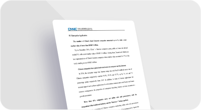 IV. Enterprise Application The number of China's listed Internet companies amounted up to 91, with a total market value of more than RMB 5 trillion. 3 Up to December 2016, China’s Internet companies going public at home and abroad totaled 91, with a total market value of RMB 5.4 trillion. Among them, Tencent and Alibaba are two representatives of China's Internet companies whose market value accounted for 57% of the total, standing at over RMB 3 trillion. Chinese companies have gained universal access to computer and the Internet. In 2016, the computer usage rate, Internet usage rate and fixed broadband access rate of Chinese companies respectively reached 99.0%, 95.6% and 93.7%, up by 3.8, 6.6 and 7.4 percentage points respectively from 2015. In addition, in terms of Internet applications for internal support such as those applications for information communication and finance and human resource management, the proportion of enterprises launching Internet activities maintained a growth momentum. More than 40% companies carry out online sales and procurement, with the integration of the traditional industry and the “Internet +” being expedited. In 2016, the proportion of Chinese companies conducting online sales and procurement respectively reached 45.3% and 45.6%, increasing by more than 10 percentage points. Against the backdrop of the fast integration of the new and traditional media, the Internet has played an increasingly important role in the marketing system of enterprises, with the proportion of companies doing marketing via the Internet amounting to 38.7%. In addition, 60% of enterprises have built a system of IT applications, increasing by 13.4 percentage points compared with 2015. In the transformation of supply chain, companies have given high priority to and brought into full play the role of the Internet. 3 Internet companies in this report refer to those enterprises whose revenue in Internet business accounts for more than 50% of the total, and Internet business includes Internet advertising and marketing, personal Internet value-added services, online games, e-commerce, etc. The standards for the above definition need to be set by seeing whether these companies mainly depend on Internet products in their operation including mobile Internet 4 operating systems, mobile Internet Apps and traditional PC Internet sites. The 39th Statistical Report on Internet Development in China