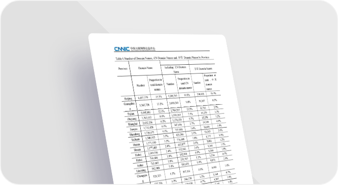 Table 6 Number of Domain Names, .CN Domain Names and .中国 Domain Names by Province Province Domain Name Including: .CN Domain .中国Domain Names Name Proportion in Proportion in Proportion in total . 中国 Number total domain Number total CN Number domain names domain names names Beijing 6,457,379 15.3% 3,288,765 16.0% 238,605 50.3% Guangdon 5,565,728 13.2% 2,018,360 9.8% 39,387 8.3% g Fujian 5,095,881 12.1% 2,789,537 13.5% 11,721 2.5% Zhejiang 3,361,612 8.0% 1,550,269 7.5% 15,259 3.2% Shanghai 2,632,136 6.2% 1,174,350 5.7% 15,258 3.2% Jiangsu 1,732,428 4.1% 547,496 2.7% 19,168 4.0% Shandong 1,720,673 4.1% 737,900 3.6% 16,694 3.5% Sichuan 1,380,915 3.3% 423,384 2.1% 12,563 2.6% Hunan 1,371,930 3.2% 774,488 3.8% 4,175 0.9% Henan 1,177,483 2.8% 413,877 2.0% 5,881 1.2% Hubei 1,019,556 2.4% 532,941 2.6% 5,360 1.1% Hebei 749,406 1.8% 192,994 0.9% 6,566 1.4% Anhui 745,403 1.8% 233,707 1.1% 3,534 0.7% Liaoning 592,988 1.4% 181,633 0.9% 9,870 2.1% Chongqin 528,323 1.2% 197,161 1.0% 6,411 1.4% g Guangxi 522,256 1.2% 244,378 1.2% 3,144 0.7% Shaanxi 430,800 1.0% 138,618 0.7% 4,587 1.0% Jiangxi 384,982 0.9% 134,711 0.7% 5,181 1.1% Tianjin 353,755 0.8% 113,681 0.6% 2,612 0.6% Yunnan 275,182 0.7% 94,529 0.5% 5,849 1.2% Shanxi 239,006 0.6% 74,283 0.4% 2,903 0.6% Heilongjia 236,937 0.6% 78,083 0.4% 6,255 1.3% ng Jilin 204,574 0.5% 65,184 0.3% 2,682 0.6% Guizhou 188,110 0.4% 76,950 0.4% 1,953 0.4% Hainan 146,650 0.3% 59,125 0.3% 546 0.1% Xinjiang 133,669 0.3% 55,014 0.3% 1111 0.2% Gansu 111,130 0.3% 29,941 0.1% 702 0.1% Inner 107,501 0.3% 43,325 0.2% 2152 0.5% Mongolia Qinghai 45,972 0.1% 21,700 0.1% 183 0.0% Ningxia 42,549 0.1% 15,843 0.1% 457 0.1% 122 Tibet 10,475 0.0% 6,433 0.0% 283 0.1% The 39th Statistical Report on Internet Development in China
