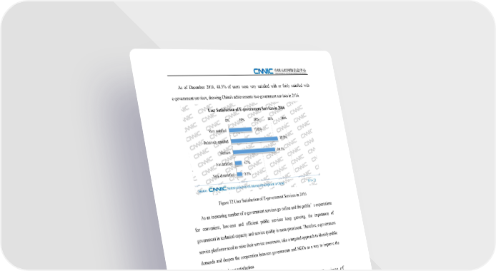 As of December 2016, 48.5% of users were very satisfied with or fairly satisfied with e-government services, showing China's achievements in e-government services in 2016. User Satisfaction of E-government Services in 2016 0% 10% 20% 30% 40% Very satisfied 15.6% 32.9% Relatively satisfied Medium 29.5% Not satisfied 4.7% Very dissatisfied 3.5% Source: Statistical Survey on Internet Development in China 2016.12 Figure 72 User Satisfaction of E-government Services in 2016 As an increasing number of e-government services go online and the public’s expectations for convenient, low-cost and efficient public services keep growing, the importance of government in technical capacity and service quality is more prominent. Therefore, e-government service platforms need to raise their service awareness, take a targeted approach to identify public demands and deepen the cooperation between governments and NGOs as a way to improve the service level and user satisfaction. (III) The Overall Distribution and Distribution by Province of Domain Names with the Suffix “.gov.cn” As of December 2016, China had 53,546 domain names with the suffix “.gov.cn” covering 31 Chinese provinces, autonomous regions and municipalities directly under the central government. Table 9 The Distribution by Province of Domain Names with the Suffix “.gov.cn” in Mainland China in 2016 Province Number Proportion Ranking 4,341 8.1% 1 Shandong 3,910 7.3% 2 Jiangsu 3,760 7.0% 3 Sichuan 9191 The 39th Statistical Report on Internet Development in China