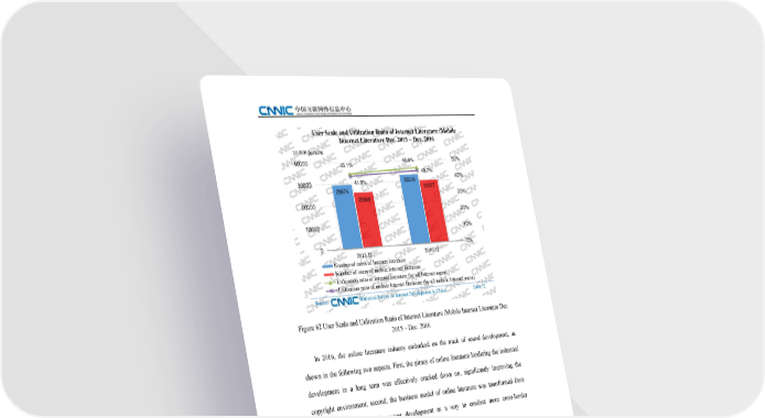 User Scale and Utilization Ratio of Internet Literature /Mobile Internet Literature Dec. 2015 – Dec. 2016 10,000persons 40000 43.1% 45.6% 50% 43.7% 40% 30000 41.8% 33319 29674 30377 25908 30% 20000 20% 10000 10% 0 0% 2015.12 2016.12 Number of users of Internet literature Number of users of mobile Internet literature Utilization ratio of Internet literature (by all Internet users) Utilization ratio of mobile Internet literature (by all mobile Internet users) Source: Statistical Survey on Internet Development in China 2016.12 Figure 62 User Scale and Utilization Ratio of Internet Literature /Mobile Internet Literature Dec. 2015 – Dec. 2016 In 2016, the online literature industry embarked on the track of sound development, as shown in the following two aspects. First, the piracy of online literature hindering the industrial development in a long term was effectively cracked down on, significantly improving the copyright environment; second, the business model of online literature was transformed from one-time sale to sustained content development as a way to conduct more cross-border cooperation. The piracy of online literature was fought by related departments in 2016, with the awareness of intellectual property protection inside the industry coming into being. In January, Yuewen Group established a “Copyright Alliance”, announcing that it has contained the illegal spreading of 40,000 copyrighted works, and filed 193 lawsuits of right protection and succeeded in them. In May, Baidu Tieba rectified the online literature infringement on a large scale, closing a large number of post bars relating to online literature works and deleting infringing content. In July, the “Sword Network 2016” campaign was jointly initiated by the Cyberspace Administration of China, the Ministry of Public Security and other related departments, which aimed at putting more efforts to combat piracy against online literature. The corresponding system of black and 74 white lists was established. The 39th Statistical Report on Internet Development in China
