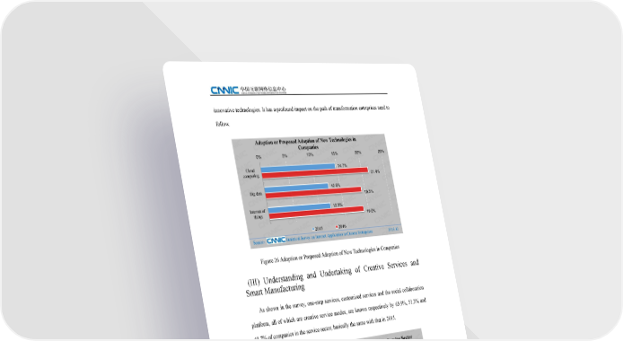 innovative technologies. It has a profound impact on the path of transformation enterprises need to follow. Adoption or Proposed Adoption of New Technologies in Companies 0% 5% 10% 15% 20% 25% Cloud 14.7% computing 21.4% 12.6% Big data 19.3% Internet of 12.3% things 19.0% 2015 2016 Source: Statistical Survey on Internet Application in Chinese Enterprises 2016.12 Figure 26 Adoption or Proposed Adoption of New Technologies in Companies (III) Understanding and Undertaking of Creative Services and Smart Manufacturing As shown in the survey, one-stop services, customized services and the social collaboration platform, all of which are creative service modes, are known respectively by 65.9%, 51.3% and 41.7% of companies in the service sector, basically the same with that in 2015. Understanding of Creative Service Modes in the Service Sector 0% 20% 40% 60% 80% 69.2% one-stop services 65.9% 51.4% customized services 51.3% social collaboration 41.1% platform 41.7% 2015 2016 Source: Statistical Survey on Internet Application in Chinese Enterprises 2016.12 Figure 27 Understanding of Creative Service Modes in the Service Sector One-stop services, customized services and the social collaboration platform, all of which are 30 creative service modes, are launched or to be launched respectively by 25.6%, 19.0% and 14.0% The 39th Statistical Report on Internet Development in China