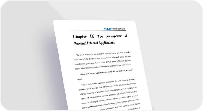 Chapter IX The Development of Personal Internet Applications The year of 2016 saw the fast development of personal Internet applications. Except for e-mail, users of other applications were growing. Users of online meal ordering and online medical services grew respectively by 83.7% and 28.0%; in terms of mobile phone applications, users of mobile meal ordering and mobile education increased respectively by 86.2% and 84.8%. Users of basic Internet applications grow steadily and enterprises focus on expanded content. Users of basic Internet applications such as those for instant messaging, information searching, network news and social networking grow steadily, with core business entering a relatively mature stage of development. Instant messaging regains growth by expanding service content, with individual’s instant messaging differentiated more obviously; search engine makes progress in technological innovation and service extension and provides targeted services for users to meet their personalized demands for different scenarios, forming a multi-service ecology system with search as an interface; network news is introduced to a diverse range of platforms with various forms, which sets higher requirements for supervision and content innovation; and further segmented and enriched, social networking platforms are becoming more innovative and targeted at smaller user groups. The scale of online meal ordering users sees significant increase, with the integration of online and offline services being expedited. Business transaction applications kept increasing in 2016. Users of online meal ordering annually grew by 83.7%. The online shopping market is becoming more diversified and standardized. Specifically, online shopping, driven by Internet celebrity and live broadcast, enriches itself with more entertainment and enables its customers to experience more content; cross-border e-commerce enters the phase of adjustment; and rural e-commerce improves its services at a faster pace. As the scale of online meal ordering users increases by leaps and bounds, 5353 The 39th Statistical Report on Internet Development in China