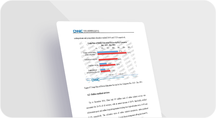 undergraduate and postgraduate education reached 28.6% and 17.2% respectively. Usage Rate of Online Education Services by Key Categories Dec. 2015 – Dec. 2016 0% 10% 20% 30% 40% 50% 60% Primary and secondary 37.7% 53.4% school education Professional education 34.4% 13.0% Language training 28.6% Undergraduate/ 9.0% 17.2% postgraduate education 2015.12 2016.12 Source: Statistical Survey on Internet Development in China 2016.12 Figure 67 Usage Rate of Online Education Services by Key Categories Dec. 2015 – Dec. 2016 6.2 Online medical services Up to December 2016, China had 195 million users of online medical services who accounted for 26.6% of all netizens, with an annual increase of 28.0%. Specifically, medical information query and online hospital registration booking have high utilization ratios, 10.8% and 10.4% respectively. The utilization ratios of online medical consultation, online-purchased drugs/medical devices/healthcare products and sports fitness management all register about 6%. Usage Rate of Online Medical Services Dec. 2015 – Dec. 2016 0% 5% 10% 15% 10.4% Medical information query 10.8% 8.3% Online hospital registration booking 10.4% 6.6% Online medical consultation 6.4% Online-purchased drugs/medical 4.6% 5.2% devices/healthcare products 3.9% Sports fitness management 5.9% 2015.12 2016.12 Source: Statistical Survey on Internet Development in China 2016.12 82 Figure 68 Usage Rate of Online Medical Services Dec. 2015 – Dec. 2016 The 39th Statistical Report on Internet Development in China