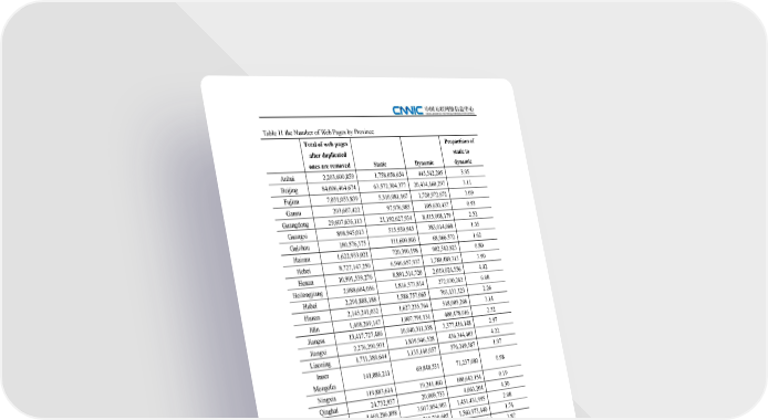 Table 11 the Number of Web Pages by Province Total of web pages Proportions of after duplicated static to ones are removed Static Dynamic dynamic Anhui 2,203,600,859 1,758,058,654 445,542,205 3.95 Beijing 84,006,464,674 63,572,304,377 20,434,160,297 3.11 Fujian 7,031,053,839 5,310,081,167 1,720,972,672 3.09 Gansu 203,607,422 97,976,985 105,630,437 0.93 Guangdong 29,607,636,113 21,192,627,934 8,415,008,179 2.52 Guangxi 898,945,013 515,930,945 383,014,068 1.35 Guizhou 180,576,375 111,609,803 68,966,572 1.62 Hainan 1,622,933,021 720,390,198 902,542,823 0.80 Hebei 8,727,147,250 6,946,657,937 1,780,489,313 3.90 Henan 10,901,539,276 8,891,514,720 2,010,024,556 4.42 Heilongjiang 2,088,604,056 1,816,573,814 272,030,242 6.68 Hubei 2,291,888,188 1,588,757,065 703,131,123 2.26 Hunan 2,145,241,032 1,627,235,764 518,005,268 3.14 Jilin 1,408,269,147 1,007,791,131 400,478,016 2.52 Jiangsu 13,417,727,486 10,040,311,338 3,377,416,148 2.97 Jiangxi 2,276,290,931 1,839,946,528 436,344,403 4.22 Liaoning 1,711,389,644 1,135,140,057 576,249,587 1.97 Inner 141,086,211 69,848,531 71,237,680 0.98 Mongolia Ningxia 119,883,614 19,241,460 100,642,154 0.19 Qinghai 24,732,937 20,069,733 4,663,204 4.30 Shandong 4,469,286,898 3,017,854,903 1,451,431,995 2.08 Shanxi 4,279,684,045 2,718,710,605 1,560,973,440 1.74 Shaanxi 1,860,337,354 1,478,428,001 381,909,353 3.87 Shanghai 16,617,228,345 12,063,736,957 4,553,491,388 2.65 Sichuan 2,874,973,213 1,743,379,898 1,131,593,315 1.54 Tianjin 3,670,904,149 2,422,240,933 1,248,663,216 1.94 Tibet 4,915,396 3,471,509 1,443,887 2.40 Xinjiang 145,924,093 70,702,450 75,221,643 0.94 Yunnan 1,563,509,702 1,357,259,562 206,250,140 6.58 Zhejiang 28,277,408,194 22,083,446,020 6,193,962,174 3.57 Chongqing 1,224,795,102 841,993,950 382,801,152 2.20 The whole 235,997,583,579 176,083,292,929 2.94 country 59,914,290,650 Data source: Baidu Online Network Technology (Beijing) Co., Ltd. 127127 The 39th Statistical Report on Internet Development in China