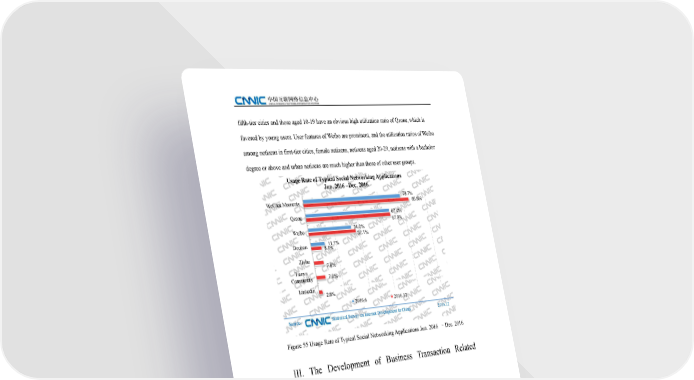 fifth-tier cities and those aged 10-19 have an obvious high utilization ratio of Qzone, which is favored by young users. User features of Weibo are prominent, and the utilization ratios of Weibo among netizens in first-tier cities, female netizens, netizens aged 20-29, netizens with a bachelor degree or above and urban netizens are much higher than those of other user groups. Usage Rate of Typical Social Networking Applications Jun. 2016 –Dec. 2016 78.7% WeChat Moments 85.8% 67.4% Qzone 67.8% 34.0% Weibo 37.1% 11.1% Douban 8.1% Zhihu 7.6% Tianya 7.0% Community Linkedin 2.8% 2016.6 2016.12 Source: Statistical Survey on Internet Development in China 2016.12 Figure 55 Usage Rate of Typical Social Networking Applications Jun. 2016 –Dec. 2016 III. The Development of Business Transaction Related Applications 3.1 Online shopping By December 2016, there have been up to 467 million online shopping users taking up 63.8% of the total netizens, with a 12.9% growth rate from the end of 2015. Specifically, 441 million people, or 63.4% of mobile internet users, have conducted online shopping on their phones, with an annual increase of 29.8%. 64 The 39th Statistical Report on Internet Development in China
