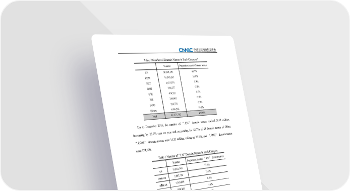 4 Table 2 Number of Domain Names in Each Category Number Proportion in total domain names CN 20,601,491 48.7% COM 14,345,243 33.9% NET 1,633,071 3.9% ORG 330,457 0.8% 中国 474,115 1.1% BIZ 210,062 0.5% INFO 224,321 0.5% Others 4,456,942 10.5% Total 42,275,702 100.0% Up to December 2016, the number of “.CN” domain names reached 20.61 million, increasing by 25.9% year on year and accounting for 48.7% of all domain names of China; “.COM” domain names were 14.35 million, taking up 33.9%; and “.中国” domain names were 474,000. Table 3 Number of “.CN” Domain Names in Each Category Number Proportion in total “.CN” domain names cn 15,044,749 73.0% com.cn 2,803,714 13.6% adm.cn 1,343,009 6.5% net.cn 938,169 4.6% ac.cn 15,322 0.1% org.cn 402,907 2.0% gov.cn 53,546 0.3% edu.cn 6,937 0.0% mil.cn 75 0.0% Total 20,608,428 100.0% Ⅳ. Websites 5 As of the end of 2016, China had 4.82 million websites , representing a yearly increase of 4 Generic top-level domains (gTLD) are provided by domestic domain name registration units. Previous data is provided by WebHosting.Info, a domain name statistical agency. Note: The number of .cn domain names does not cover .edu.cn. 5 Websites refer to those websites whose domain name registrants are in China. 99 The 39th Statistical Report on Internet Development in China