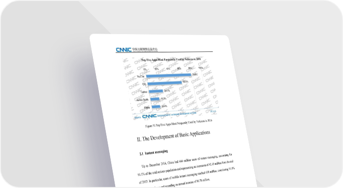 Top Five Apps Most Frequently Used by Netizens in 2016 0% 20% 40% 60% 80% 100% WeChat 79.6% 60.0% QQ Taobao 24.1% mobile Baidu 15.3% Alipay 14.4% Sourceļ¼ Statistical Survey on Internet Development in China 2016.12 Figure 51 Top Five Apps Most Frequently Used by Netizens in 2016 II. The Development of Basic Applications 2.1 Instant messaging Up to December 2016, China had 666 million users of instant messaging, accounting for 91.1% of the total netizen population and representing an increment of 42.19 million from the end of 2015. In particular, users of mobile instant messaging reached 638 million, constituting 91.8% of mobile netizens and recording an annual increase of 80.78 million. 58 The 39th Statistical Report on Internet Development in China