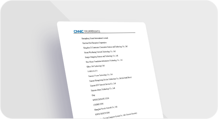Guangdong Eranet International Limited Guizhou Eric Enterprise Corporation Hangzhou E-Commerce Connection Science and Technology Co., Ltd. Henan Weichuang Network Technology Co., Ltd. Jiangsu Bangning Science and Technology Co., Ltd. Blue Ocean Foundation Information Technology Co., Ltd. Qihoo 360 Technology Ltd. NAWANG.CN Xiamen 35.com Technology Co., Ltd Xiamen Shangzhong On-line Technology Co., Ltd (its brand Bizcn) Xiamen ZZY Network Service Co., Ltd Xiamen eName Technology Co., Ltd. Oray WWW.CHINAFU.COM CNDNS.COM Shanghai Yovole Network Co., Ltd. WWW.IDCICP.COM Shenzhen Tencent Computer System Co., Ltd. (Tencent Security) WWW.EIMS.COM.CN WWW.CNKUAI.COM Sina Weibo WWW.DNSPOD.CN Zhengzhou Century Chuanglian Electronic Technology Development Co., Ltd. Zhengzhou Zitian Network Technology Co., Ltd. Zhongqi Power S&T Co., Ltd. 132 The 39th Statistical Report on Internet Development in China