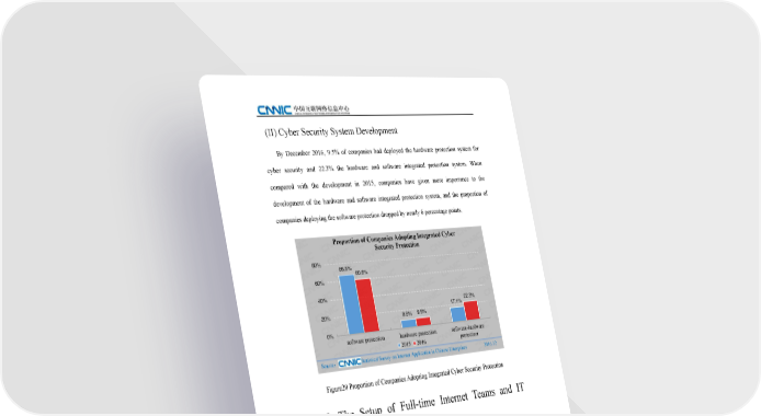 (II) Cyber Security System Development By December 2016, 9.5% of companies had deployed the hardware protection system for cyber security and 22.3% the hardware and software integrated protection system. When compared with the development in 2015, companies have given more importance to the development of the hardware and software integrated protection system, and the proportion of companies deploying the software protection dropped by nearly 6 percentage points. Proportion of Companies Adopting Integrated Cyber Security Protection 80% 66.5% 60.6% 60% 40% 17.1% 22.3% 20% 8.9% 9.5% 0% software protection hardware protection software-hardware protection 2015 2016 Sourceļ¼ Statistical Survey on Internet Application in Chinese Enterprises 2016.12 Figure20 Proportion of Companies Adopting Integrated Cyber Security Protection II. The Setup of Full-time Internet Teams and IT Training for Employees By December 2016, 32.9% of companies had set up full-time teams responsible for Internet-related operation & maintenance, development, e-commerce and e-marketing, significantly rising compared with 2015. 26 The 39th Statistical Report on Internet Development in China