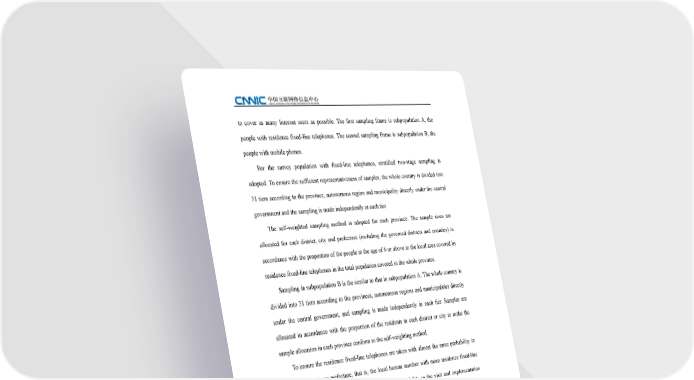 to cover as many Internet users as possible. The first sampling frame is subpopulation A, the people with residence fixed-line telephones. The second sampling frame is subpopulation B, the people with mobile phones. For the survey population with fixed-line telephones, stratified two-stage sampling is adopted. To ensure the sufficient representativeness of samples, the whole country is divided into 31 tiers according to the province, autonomous region and municipality directly under the central government and the sampling is made independently at each tier. The self-weighted sampling method is adopted for each province. The sample sizes are allocated for each district, city and prefecture (including the governed districts and counties) in accordance with the proportion of the people at the age of 6 or above in the local area covered by residence fixed-line telephones in the total population covered in the whole province. Sampling in subpopulation B is the similar to that in subpopulation A. The whole country is divided into 31 tiers according to the provinces, autonomous regions and municipalities directly under the central government, and sampling is made independently in each tier. Samples are allocated in accordance with the proportion of the residents in each district or city to make the sample allocation in each province conform to the self-weighting method. To ensure the residence fixed-line telephones are taken with almost the same probability in each district, city or prefecture, that is, the local bureau number with more residence fixed-line telephones will more likely be taken, and for easier operability in the visit and implementation work, the residence fixed-line telephone numbers in each district, city and prefecture are taken according to the following procedures: For mobile phone user groups, all mobile bureau numbers in each district, city and prefecture are sampled; a certain quantity of 4-digit random numbers are generated according to the valid sample size in each district, city or prefecture, and then combined with the mobile bureau numbers in each district, city or prefecture to form a number library (local bureau number + the random 4-digit number); randomly order the number library; dial and visit the randomly ordered number library. Survey of the subpopulation with fixed-line telephones is similar to that of the subpopulation with mobile phones: a random number is generated and combined with the local bureau number to form a telephone number, and then such number is dialed and visited. To avoid 112 repeated sampling, only residence fixed-line telephones are visited. The 39th Statistical Report on Internet Development in China