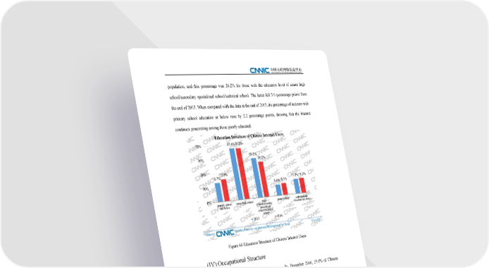 population, and this percentage was 26.2% for those with the education level of senior high school/secondary specialized school/technical school. The latter fell 3.0 percentage points from the end of 2015. When compared with the data at the end of 2015, the percentage of netizens with primary school education or below rose by 2.2 percentage points, showing that the Internet continues penetrating among those poorly educated. Education Structure of Chinese Internet Users 40% 37.4%37.3% 30% 29.2% 26.2% 20% 15.9% 13.7% 11.2%11.5% 10% 8.4% 9.1% 0% primary school junior high school high junior college undergraduate and below school/secondary education and above specialized school/technical school 2015 2016 Sourceļ¼ Statistical Survey on Internet Development in China 2016.12 Figure 44 Education Structure of Chinese Internet Users (IV) Occupational Structure Students are the largest group of Internet users. By December 2016, 25.0% of Chinese netizens were students; 22.7% were self-employed persons/freelancers, up by 0.6 percentage points from the end of 2015; and 14.7% were enterprise managers/ordinary staff members. The proportions of these three groups remained relatively stable. The 39th Statistical Report on Internet Development in China 4747