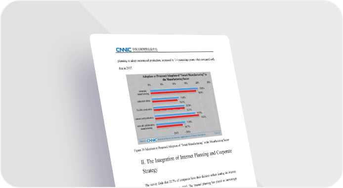 planning to adopt customized production, increased by 1.4 percentage points when compared with that in 2015. Adoption or Proposed Adoption of “Smart Manufacturing” in the Manufactoring Sector 0% 5% 10% 15% 20% 25% automatic 19.9% manufacturing 18.9% 11.0% industrial robots 10.4% 12.8% flexible production 12.7% 16.8% customized production 18.2% network collaborative 11.9% manufacturing 10.7% 2015 2016 Source: Statistical Survey on Internet Application in Chinese Enterprises 2016.12 Figure 30 Adoption or Proposed Adoption of “Smart Manufacturing” in the Manufactoring Sector II. The Integration of Internet Planning and Corporate Strategy The survey finds that 22.7% of companies have their decision makers leading the Internet planning, doubling the proportion in 2015. The Internet planning has played an increasingly important role in the development strategy of enterprises. Proportion of Companies Whose Decision Makers Lead the Internet Planning 30% 22.7% 20% 13.0% 10% 0% 2015 2016 Source: Statistical Survey on Internet Application in Chinese Enterprises 2016.12 32 Figure 31 Proportion of Companies Whose Decision Makers Lead the Internet Planning The 39th Statistical Report on Internet Development in China
