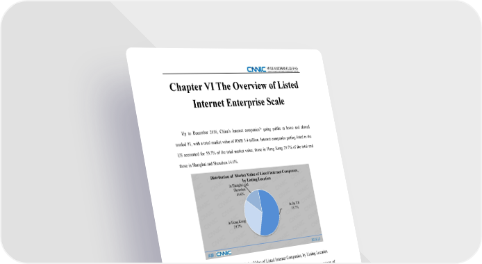 Chapter VI The Overview of Listed Internet Enterprise Scale 14 Up to December 2016, China’s Internet companies going public at home and abroad totaled 91, with a total market value of RMB 5.4 trillion. Internet companies getting listed in the US accounted for 55.7% of the total market value, those in Hong Kong 29.7% of the total and those in Shanghai and Shenzhen 14.6%. Distribution of Market Value of Listed Internet Companies, by Listing Location in Shanghai and Shenzhen 14.6% in the US 55.7% in Hong Kong 29.7% 来源: 2016.12 Figure 34 Distribution of Market Value of Listed Internet Companies, by Listing Location Tencent (listed in Hong Kong) and Alibaba (listed in the US) are two representatives of China's Internet companies whose market value accounted for 57.0% of the total of China’s listed Internet companies, standing at RMB 3 trillion. 14 Listed Internet companies refer to those going public in the US, Hong Kong, Shanghai and Shenzhen, whose revenue from their respective Internet business takes up more than 50% of their total. Internet business includes Internet advertising and marketing, personal Internet value-added services, online games, e-commerce, etc. The standards for the above definition need to be set by seeing whether these companies mainly depend on Internet products in their operation including mobile Internet operating systems, mobile Internet Apps and traditional PC Internet sites. 3535 The 39th Statistical Report on Internet Development in China