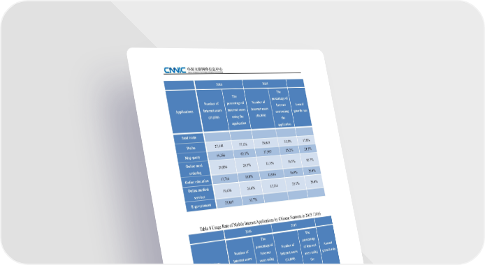 2016 2015 The The percentage of Number of percentage of Number of Internet Annual Applications Internet users Internet users Internet users users using growth rate (10,000) using the (10,000) the application application fund trade Weibo 27,143 37.1% 23,045 33.5% 17.8% Map query 46,166 63.1% 37,997 55.2% 21.5% Online meal 20,856 28.5% 11,356 16.5% 83.7% ordering Online education 13,764 18.8% 11,014 16.0% 25.0% Online medical 19,476 26.6% 15,211 22.1% 28.0% services E-government 23,897 32.7% Table 8 Usage Rate of Mobile Internet Applications by Chinese Netizens in 2015 / 2016 2016 2015 The The percentage of percentage Number of Number of Internet of Internet Annual Applications Internet users Internet users users using users using growth rate (10,000) (10,000) the the application application Mobile instant 63,797 91.8% 55,719 89.9% 14.5% messaging Mobile Netnews 57,126 82.2% 48,165 77.7% 18.6% Mobile search 57,511 82.7% 47,784 77.1% 20.4% Mobile online music 46,791 67.3% 41,640 67.2% 12.4% Mobile online video 49,987 71.9% 40,508 65.4% 23.4% Mobile online 46,920 67.5% 35,771 57.7% 31.2% payment Mobile online 44,093 63.4% 33,967 54.8% 29.8% shopping Mobile online game 35,166 50.6% 27,928 45.1% 25.9% 56 Mobile banking 33,357 48.0% 27,675 44.6% 20.5% The 39th Statistical Report on Internet Development in China