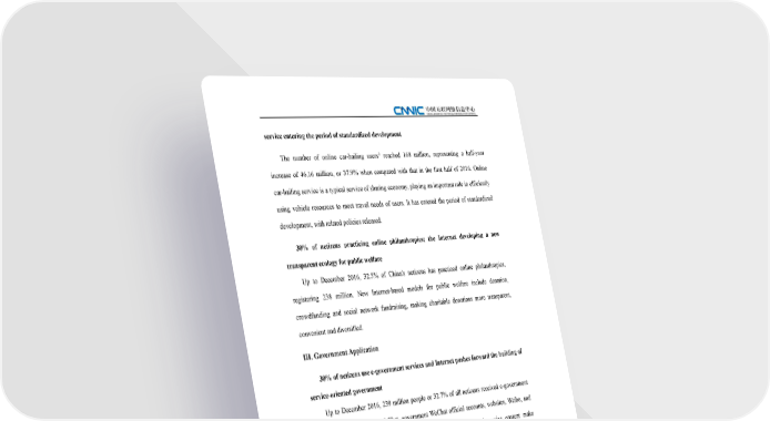 service entering the period of standardized development 2 The number of online car-hailing users reached 168 million, representing a half-year increase of 46.16 million, or 37.9% when compared with that in the first half of 2016. Online car-hailing service is a typical service of sharing economy, playing an important role in efficiently using vehicle resources to meet travel needs of users. It has entered the period of standardized development, with related policies released. 30% of netizens practicing online philanthropies; the Internet developing a new transparent ecology for public welfare Up to December 2016, 32.5% of China's netizens has practiced online philanthropies, registering 238 million. New Internet-based models for public welfare include donation, crowdfunding and social network fundraising, making charitable donations more transparent, convenient and diversified. III. Government Application 30% of netizens use e-government services and Internet pushes forward the building of service-oriented government Up to December 2016, 239 million people or 32.7% of all netizens received e-government services based on Alipay, WeChat, government WeChat official accounts, websites, Weibo, and mobile Apps. All these interconnected platforms and their detailed service content make e-government services more smart and improve users’ happiness and satisfaction. New-media e-government platforms cover all regions and fields to facilitate the release of government information. In 2016, 31 provinces, autonomous regions and municipalities directly under the Central Government in Mainland China launched government Weibo and Zhengwutoutiao covering all vertical fields such as government, public security, Youth League committee, transportation, justice, etc. Governments and institutions at all levels should speed up the development of “WeChat, Weibo and news Apps” and boost the instant and transparent release of government information via the Internet. 2 Online car-hailing services include private car booking and carpooling services. 33 The 39th Statistical Report on Internet Development in China