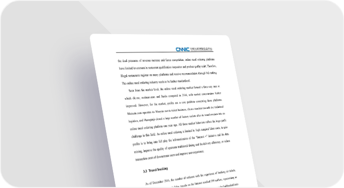 the dual pressures of revenue increase and fierce competition, online meal ordering platforms have limited investment in restaurant qualification inspection and product quality audit. Therefore, illegal restaurants register on many platforms and receive recommendation through bid ranking. The online meal ordering industry needs to be further standardized. Seen from the market level, the online meal ordering market formed a three-way race in which ele.me, meituan.com and Baidu competed in 2016, with market concentration further improved. However, for the market, profits are a core problem concerning these platforms. Meituan.com operates its Maoyan movie ticket business, ele.me marches towards the traditional logistics, and Huangtaiji closed a large number of factory outlets after its transformation into an online meal ordering platform one year ago. All these market behaviors reflect the huge profit challenge in this field. As online meal ordering is limited by high marginal labor costs, to gain profits is to bring into full play the infromatization of the “Internet +” initiative and the data mining, improve the quality of upstream traditional dining and the delivery efficiency, or reduce transaction costs of downstream users and improve user experience. 3.3 Travel booking As of December 2016, the number of netizens with the experience of booking air tickets, hotel rooms, train tickets or holiday travels on the Internet reached 299 million, representing an increase of 39.67 million or 15.3% over the end of 2015. The Internet users who had booked train tickets, air tickets, hotel rooms and holiday travels online respectively accounted for 34.0%, 15.9%, 17.2% and 7.4% of total netizens. Specifically, the number of netizens having booked air tickets, hotel rooms, train tickets and holiday travels on the mobile Internet reached 262 million, representing an increase of 51.89 million or 24.7% over the end of 2015. Chinese netizens’ utilization ratio of mobile travel booking increased from 33.9% to 37.7%. The 39th Statistical Report on Internet Development in China 6767