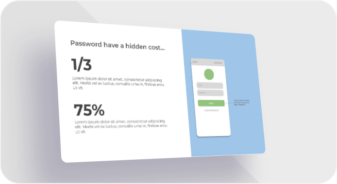 Password have a hidden cost… 1/3 Lorem ipsum dolor sit amet, consectetur adipiscing Email elit. Morbi vel ex luctus, convallis urna in, finibus arcu. Ut vit Password 75% of users that select this button abandon the Login digital interaction Forget Password? 75% Lorem ipsum dolor sit amet, consectetur adipiscing elit. Morbi vel ex luctus, convallis urna in, finibus arcu. Ut vit