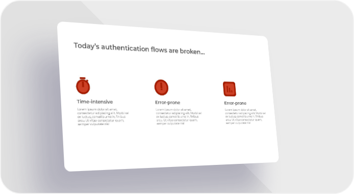 Today’s authentication flows are broken… Time-intensive Error-prone Error-prone Lorem ipsum dolor sit amet, Lorem ipsum dolor sit amet, Lorem ipsum dolor sit amet, consectetur adipiscing elit. Morbi vel consectetur adipiscing elit. Morbi vel consectetur adipiscing elit. Morbi vel ex luctus, convallis urna in, finibus ex luctus, convallis urna in, finibus ex luctus, convallis urna in, finibus arcu. Ut vitae consectetur quam, arcu. Ut vitae consectetur quam, arcu. Ut vitae consectetur quam, semper vulputate nisl semper vulputate nisl semper vulputate nisl
