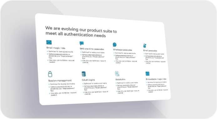 We are evolving our product suite to meet all authentication needs Email magic links SMS one-time passcodes Whatsapp passcodes Email passcodes Optimized for desktop and mobile Optimized for desktop and mobile Optimized for desktop and mobile Optimized for desktop and mobile Remove passwords entirely or Remove passwords entirely or Remove passwords entirely or Remove passwords entirely or streamline your “forgot password” streamline your “forgot password” streamline your “forgot password” streamline your “forgot password” flow flow flow flow One-click user invitations + account One-click user invitations + account One-click user invitations + account One-click user invitations + account creation creation creation creation OAuth logins WebAuthn Embeddable magic links Session management Optimized for desktop and mobile Optimized for desktop and mobile Optimized for desktop and mobile Optimized for desktop and mobile Remove passwords entirely or Remove passwords entirely or Remove passwords entirely or Remove passwords entirely or streamline your “forgot password” streamline your “forgot password” streamline your “forgot password” streamline your “forgot password” flow flow flow flow One-click user invitations + account One-click user invitations + account One-click user invitations + account One-click user invitations + account creation creation creation creation