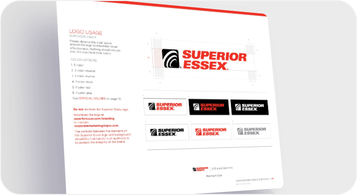 SUPERIOR ESSEX BRAND GUIDELINES | 07 REV 03.22/VER 4.0 LOGO USAGE SUPERIOR ESSEX Please observe the clear space around the logo to maximize visual effectiveness. Nothing should intrude into this specified clear space. COLOR OPTIONS 1. 2-color 2. 2-color reverse 3. 1-color reverse 4. 1-color black 5. 1-color red 6. 1-color gray See OFFICIAL COLORS on page 12. Do not recreate the Superior Essex logo. Download the logo at superioressex.com/branding or contact corporatemarketing@spsx.com . The contrast between the elements of the Superior Essex logo and background should be maintained in all applications to protect the integrity of the brand. 0.15 inch (3.8 mm) Minimum Size 1. 4. 2. 5. 3. 6. X X X X X X X X 2X