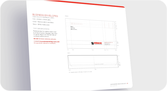SUPERIOR ESSEX BRAND GUIDELINES | 25 REV 03.22/VER 4.0 BUSINESS ENVELOPES ASIA PACIFIC BUSINESS UNITS Size - 220mm x 110mm (#5) Color - Pantone 485 C and Black Stock - 80 lb. matte cover TYPE SPECIFICATIONS Preferred size for address block text is 10-12 pt (Calibri, Regular). Each line of typing aligns with the left side of company address block. Do not recreate stationery artwork. Contact corporatemarketing@spsx.com for questions related to envelopes. Everywhere You Live and Work® Address Organization Addressee’s Name 0.0 20.0 105.0 162.0 172.0 212.0 8.0 0.0 15.0 28.0 81.0 86.0 95.0 27.0 0.0 34.0 38.0 0.00 110.0 21.0 BACK FRONT All measurements in millimeters. Artwork not to scale. Essex Magnet Wire (Suzhou) Ltd. No.68, Lushan Road, Suzhou High-tech Zone Jiangsu, 21529, China
