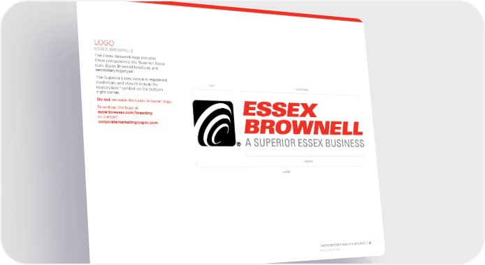 SUPERIOR ESSEX BRAND GUIDELINES | 10 REV 03.22/VER 4.0 LOGO ESSEX BROWNELL The Essex Brownell logo includes three components: the Superior Essex icon, Essex Brownell logotype and secondary logotype. The Superior Essex icon is a registered trademark and should include the registration ® symbol on the bottom right corner. Do not recreate the Essex Brownell logo. Download the logo at superioressex.com/branding or contact corporatemarketing@spsx.com . Logotype Tagline Icon Logo