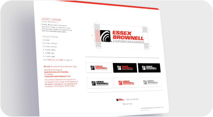 SUPERIOR ESSEX BRAND GUIDELINES | 11 REV 03.22/VER 4.0 LOGO USAGE ESSEX BROWNELL Please observe the clear space around the logo to maximize visual effectiveness. Nothing should intrude into this specified clear space. COLOR OPTIONS 1. 2-color 2. 2-color reverse 3. 1-color reverse 4. 1-color black 5. 1-color red 6. 1-color gray See OFFICIAL COLORS on page 12. Do not recreate the Essex Brownell logo. Download the logo at superioressex.com/branding or contact corporatemarketing@spsx.com . The contrast between the elements of the Superior Essex logo and background should be maintained in all applications to protect the integrity of the brand. Minimum Size 0.15 inch (3.8 mm) 1. 4. 2. 5. 3. 6. X X X X X X X X 2X