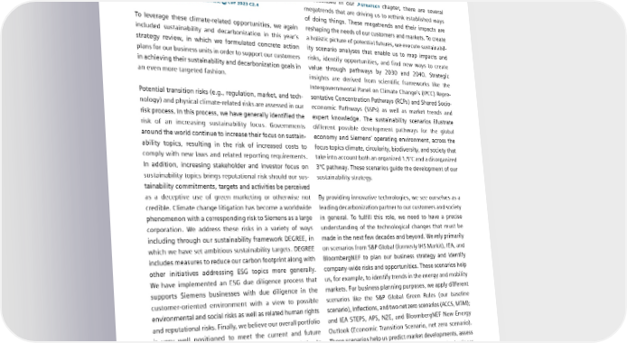 7.4 Task Force on ClimateRelated Financial Disclosures (TCFD) low-carbon economy. Siemens also welcomes and supports and risks. Our decarbonization target, which is approved by recent legislative and governmental measures to accelerate the Science-Based Targets initiative, is aligned with the 1.5°C the mitigation of climate change, especially in Europe such target and therefore the Paris Agreement. as through the Green Deal or sustainable finance initiatives. SIEMENS FINANCIAL REPORT FOR FISCAL 2023, COMBINED MANAGEMENT As described in our STRATEGY chapter, there are several REPORT, CHAPTER 8.4 OPPORTUNITIES, CDP 2023 C2.4 megatrends that are driving us to rethink established ways of doing things. These megatrends and their impacts are To leverage these climate-related opportunities, we again reshaping the needs of our customers and markets. To create included sustainability and decarbonization in this year’s a holistic picture of potential futures, we execute sustainabil- strategy review, in which we formulated concrete action ity scenario analyses that enable us to map impacts and plans for our business units in order to support our customers risks, identify opportunities, and find new ways to create in achieving their sustainability and decarbonization goals in value through pathways by 2030 and 2040. Strategic an even more targeted fashion. insights are derived from scientific frameworks like the Intergovernmental Panel on Climate Change’s (IPCC) Repre- Potential transition risks (e.g., regulation, market, and tech- sentative Concentration Pathways (RCPs) and Shared Socio- nology) and physical climate-related risks are assessed in our economic Pathways (SSPs) as well as market trends and risk process. In this process, we have generally identified the expert knowledge. The sustainability scenarios illustrate risk of an increasing sustainability focus. Governments different possible development pathways for the global around the world continue to increase their focus on sustain- economy and Siemens’ operating environment, across the ability topics, resulting in the risk of increased costs to focus topics climate, circularity, biodiversity, and society that comply with new laws and related reporting requirements. take into account both an organized 1.5°C and a disorganized In addition, increasing stakeholder and investor focus on 3°C pathway. These scenarios guide the development of our sustainability topics brings reputational risk should our sus- sustainability strategy. tainability commitments, targets and activities be perceived as a deceptive use of green marketing or otherwise not By providing innovative technologies, we see ourselves as a credible. Climate change litigation has become a worldwide leading decarbonization partner to our customers and society phenomenon with a corresponding risk to Siemens as a large in general. To fulfill this role, we need to have a precise corporation. We address these risks in a variety of ways understanding of the technological changes that must be including through our sustainability framework DEGREE, in made in the next few decades and beyond. We rely primarily which we have set ambitious sustainability targets. DEGREE on scenarios from S&P Global (formerly IHS Markit), IEA, and includes measures to reduce our carbon footprint along with BloombergNEF to plan our business strategy and identify other initiatives addressing ESG topics more generally. company-wide risks and opportunities. These scenarios help We have implemented an ESG due diligence process that us, for example, to identify trends in the energy and mobility supports Siemens businesses with due diligence in the markets. For business planning purposes, we apply different customer- oriented environment with a view to possible scenarios like the S&P Global Green Rules (our baseline environmental and social risks as well as related human rights scenario), Inflections, and two net zero scenarios (ACCS, MTM); and reputational risks. Finally, we believe our overall portfolio and IEA STEPS, APS, NZE, and BloombergNEF New Energy is very well positioned to meet the current and future Outlook (Economic Transition Scenario, net zero scenario). sustainability needs of our customers and the societies in These scenarios help us predict market developments, assess which we operate. the implications of various scenarios, and make business SIEMENS FINANCIAL REPORT FOR FISCAL 2023, COMBINED MANAGEMENT decisions on this basis. With a view to our own business, REPORT, CHAPTER 8.3 RISKS, CDP 2023 C2.3 analyzing climate-related scenarios allows us to predict the potential consequences in terms of regulatory requirements, Analysis of climaterelated scenarios R&D, and customer trends and requirements. Our business Different climate-related scenarios are used at Siemens for units also conduct business-specific scenario analyses. different purposes: for instance, for our business strategy CDP 2023 C3.2 and decarbonization strategy and to identify opportunities SIEMENS SUSTAINABILITY REPORT 2023 139