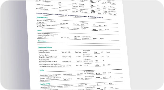 6 Our sustainability indicators Sustainability Key Performance Indicators Fiscal Year/ (KPIs) September 30th Unit FY 2023 FY 2022 +/– Standards Corporate Citizenship Donations Total Fiscal Year Million € 29.2 32.1 −9.0% GRI 201-1, WEF Total Fiscal Year % of Net Income 0.3% 0.7% −53.1% GRI 201-1, WEF Sponsoring Social programs (e.g. Arts and education) Total Fiscal Year Million € 14.0 13.5 3.5% GRI 201-1, WEF Community investment total Total Fiscal Year Million € 43.2 45.6 −5.3% GRI 201-1, WEF Total Fiscal Year % of Net Income 0.5% 1.0% −51.2% GRI 201-1, WEF Volunteering hours Total (w/o SHS) Fiscal Year No. (rounded) 36,500 32,650 11.8% GRI 201-1, WEF DEGREE SUSTAINABILITY FRAMEWORK – KPI OVERVIEW (FIGURES WITHOUT SIEMENS HEALTHINEERS) Decarbonization Scope 1+2: Emission reduction % to base year to base year Total (w/o SHS) Fiscal Year (2019) −50% −46% 9.5% Supply Chain: Emission reduction % to base year to base year Total (w/o SHS) Fiscal Year (2020)43 −0.9% 2.5% −134.0% Ethics Quota of participants of Business Conduct Guideline training up to Sept. % of total number (since FY 23) Total (w/o SHS) 30th of employees 69.0% 99.9%44 Governance Resource efficiency Quota of product families with % of relevant 45 51% 35% 43.0% Robust Eco Design Total (w/o SHS) Fiscal Year revenue Purchase Quota – % of relevant Secondary material for metals Total (w/o SHS) Fiscal Year purchase volume 35% 34% 3.0% Purchase Quota – % of relevant Secondary material for resins Total (w/o SHS) Fiscal Year purchase volume < 1% < 1% Quota of waste-to-landfill reduction % to base year to base year (w/o construction waste) Total (w/o SHS) Fiscal Year (2021) −15% −12% 20.2% Equity % of employees in Female share in top management Total (w/o SHS) Sept. 30th top management 31.1% 27.7% 12.3% Share of employees with access to % of total number Siemens employee share plans46 Total (w/o SHS) Fiscal Year of employees 99.9% 98.6% 1.3% Employability Digital learning hours per employee Total (w/o SHS) Fiscal Year No. 23 21 9.5% Level of access to Employee % of total number 42 Total (w/o SHS) Sept. 30th of employees 96% 87% 10.3% Assistance Program Improvement in global LTIFR47 % to base year to base year Total (w/o SHS) Fiscal Year (2020) −26% −19% 36.8% 42 Scope of HM Reporting: Countries >30 employees as well as affiliated companies >30 employees. 43 Base year 2020 is calculated w/o individual supplier emission data. 44 Year-to-year comparison between fiscal 2022 and fiscal 2023 is limited. The current cycle started in fiscal 2023. 45 In FY 23 the share of relevant revenue was 65% of total revenue Siemens w/o SHS. 46 Where legally possible and reasonable. 47 Number of Lost Time Cases (LTC) x 200,000 / working hours. LTC are accidents that results in at least one lost working day. SIEMENS SUSTAINABILITY REPORT 2023 123