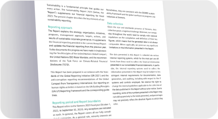 7.1 Reporting methodology 7.1 Reporting methodology Sustainability is a fundamental principle that guides our Nonetheless, they are consistent with the DEGREE sustain- every action. The Sustainability Report 2023 (below, the ability framework and the global nonfinancial programs and “Report”) supplements our financial reporting for fiscal initiatives at Siemens. 2023. The present chapter describes the key elements of our sustainability reporting. Data collection Given the size and worldwide presence of Siemens, data Reporting approach collection poses a logistical challenge. Moreover, our compa- The Report explains the strategy, organization, initiatives, nies throughout the world need to comply with national programs, management approach, targets, actions, and regulations on the compilation and definition of their key results of sustainable corporate governance. It supplements figures, which means that the generated data is not always the financial reporting provided in the current Annual Report comparable. Where applicable, we point out any significant and updates the financial reporting from the previous year. limitations in the information presented in the Report. It also documents the progress we have made in implement- ing the Ten Principles of the United Nations Global Compact, The data presented in this Report is collected via various the United Nations CEO Water Mandate, and the recommen- internal reporting systems, which for the most part are dif- dations of the Task Force on Climate-Related Financial ferent from those used to collect the financial information Disclosures (TCFD). presented in our consolidated financial statements. In partic- ular, the internal reporting systems used to collect the This Report has been prepared in accordance with the Stan- information presented in this Report may be subject to less dards of the Global Reporting Initiative (GRI 2021) and the stringent internal requirements for documentation, data anti-corruption reporting recommendations of the Global generation, and auditing, including with respect to the IT Compact from Transparency International. Our reporting on systems and controls employed. We reserve the right to human rights activities is based on the UN Guiding Principles change the internal guidelines applicable to the collection of (UN GP) Reporting Framework and the corresponding guide- the data published in this Report without prior notice. Due to lines. rounding, some of the numbers presented in this Report may not add up precisely to the totals presented, and percentages Reporting period and Report boundaries may not precisely reflect the absolute figures to which they This Report refers to the Siemens 2023 fiscal year (October 1, refer. 2022, to September 30, 2023). Any exceptions are indicated as such. In general, the Report covers all our fully consoli- dated companies. As a general rule, minority interests are not included in the Report. Unless otherwise noted, the key indicators and information reported here relate to the com- pany’s ongoing operations. Some management approaches do not cover all Siemens entities or parts of the organization. Some parts of the Siemens organization may have intro- duced specific programs or initiatives that differ from the general approaches described in this Report. SIEMENS SUSTAINABILITY REPORT 2023 125