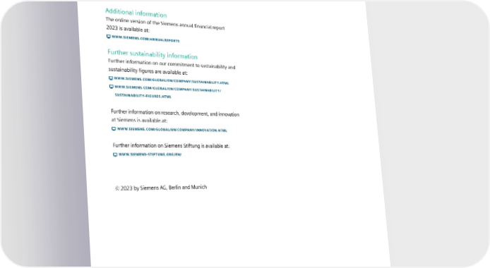 7.11 Further information and information resources 7.11 Further information and information resources Additional information The online version of the Siemens annual financial report 2023 is available at: WWW.SIEMENS.COM/ANNUALREPORTS Further sustainability information Further information on our commitment to sustainability and sustainability figures are available at: WWW.SIEMENS.COM/GLOBAL/EN/COMPANY/SUSTAINABILITY.HTML WWW.SIEMENS.COM/GLOBAL/EN/COMPANY/SUSTAINABILITY/ SUSTAINABILITYFIGURES.HTML Further information on research, development, and innovation at Siemens is available at: WWW.SIEMENS.COM/GLOBAL/EN/COMPANY/INNOVATION.HTML Further information on Siemens Stiftung is available at: WWW.SIEMENSSTIFTUNG.ORG/EN/ © 2023 by Siemens AG, Berlin and Munich SIEMENS SUSTAINABILITY REPORT 2023 157