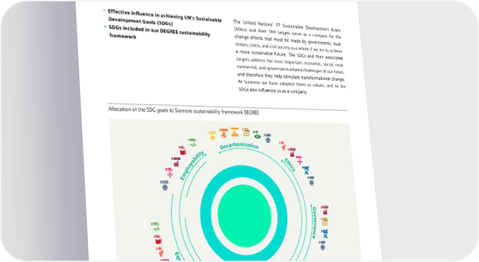 7.3 Our contribution to sustainable development of societies 7.3 Our contribution to sustainable development of societies – Effective influence in achieving UN’s Sustainable The United Nations’ 17 Sustainable Development Goals Development Goals (SDGs) (SDGs) and their 169 targets serve as a compass for the – SDGs included in our DEGREE sustainability change efforts that must be made by governments, busi- framework nesses, cities, and civil society as a whole if we are to achieve a more sustainable future. The SDGs and their associated targets address the most important economic, social, envi- ronmental, and governance-related challenges of our times, and therefore they help stimulate transformational change. At Siemens we have adopted them as values, and so the SDGs also influence us as a company. Allocation of the SDG goals to Siemens sustainability framework DEGREE n o i b za ar t i c on De y t i l i E b t a h y ic o l s mp E Go rev nan ec E q u i t y y c n e i c R f e e s o e c r u SIEMENS SUSTAINABILITY REPORT 2023 132