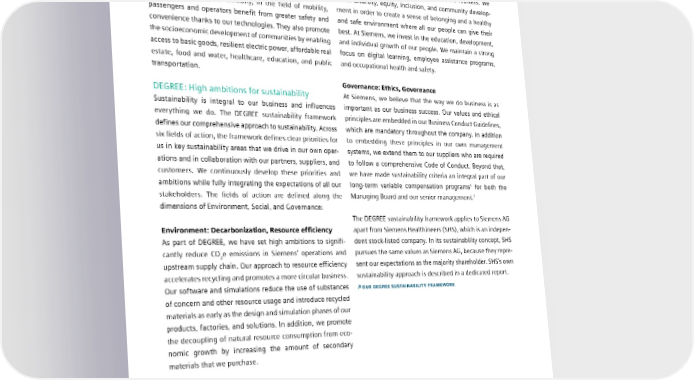1.3 Strategy People centricity & societal impact Social: Equity, Employability We enable our partners and customers to improve people’s Equal treatment and respect are the core of our corporate lives today and transform the backbone of societies for a values. Our goal is to position Siemens as the inclusive better tomorrow. For instance, our technologies support the employer of choice in all our relevant talent markets. We well-being, productivity, safety, and security of building foster diversity, equity, inclusion, and community develop- tenants and operators. Similarly, in the field of mobility, ment in order to create a sense of belonging and a healthy passengers and operators benefit from greater safety and and safe environment where all our people can give their convenience thanks to our technologies. They also promote best. At Siemens, we invest in the education, development, the socioeconomic development of communities by enabling and individual growth of our people. We maintain a strong access to basic goods, resilient electric power, affordable real focus on digital learning, employee assistance programs, estate, food and water, healthcare, education, and public and occupational health and safety. transportation. Governance: Ethics, Governance DEGREE: High ambitions for sustainability At Siemens, we believe that the way we do business is as Sustainability is integral to our business and influences important as our business success. Our values and ethical everything we do. The DEGREE sustainability framework principles are embedded in our Business Conduct Guidelines, defines our comprehensive approach to sustainability. Across which are mandatory throughout the company. In addition six fields of action, the framework defines clear priorities for to embedding these principles in our own management us in key sustainability areas that we drive in our own oper- systems, we extend them to our suppliers who are required ations and in collaboration with our partners, suppliers, and to follow a comprehensive Code of Conduct. Beyond that, customers. We continuously develop these priorities and we have made sustainability criteria an integral part of our 1 ambitions while fully integrating the expectations of all our long-term variable compensation programs for both the 2 stakeholders. The fields of action are defined along the Managing Board and our senior management. dimensions of Environment, Social, and Governance: The DEGREE sustainability framework applies to Siemens AG Environment: Decarbonization, Resource efficiency apart from Siemens Healthineers (SHS), which is an indepen- As part of DEGREE, we have set high ambitions to signifi- dent stock-listed company. In its sustainability concept, SHS cantly reduce CO e emissions in Siemens’ operations and pursues the same values as Siemens AG, because they repre- 2 upstream supply chain. Our approach to resource efficiency sent our expectations as the majority shareholder. SHS’s own accelerates recycling and promotes a more circular business. sustainability approach is described in a dedicated report. Our software and simulations reduce the use of substances OUR DEGREE SUSTAINABILITY FRAMEWORK of concern and other resource usage and introduce recycled materials as early as the design and simulation phases of our products, factories, and solutions. In addition, we promote the decoupling of natural resource consumption from eco- nomic growth by increasing the amount of secondary materials that we purchase. 1 Assessment based on the Siemens internal ESG/sustainability index, which is based on customer satisfaction (Net Promoter Score), CO reduction, and digital learning hours. 2 2 Siemens without SHS. SIEMENS SUSTAINABILITY REPORT 2023 19