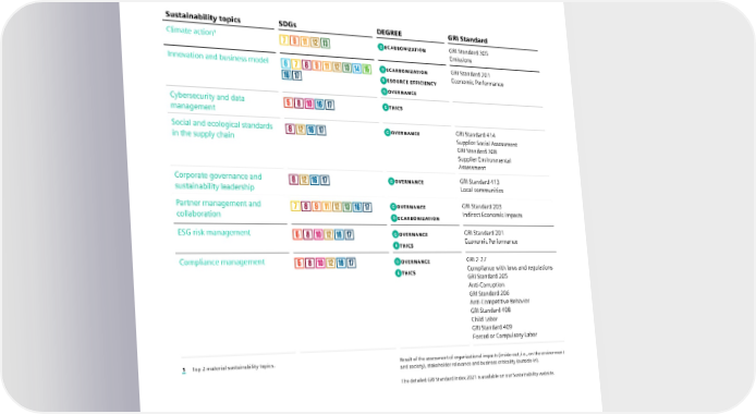 7.5 GRI Standards – key topics and boundaries 7.5 GRI Standards – key topics and boundaries Sustainability topics SDGs DEGREE GRI Standard Climate action1 D ECARBONIZATION GRI Standard 305 Emissions Innovation and business model D ECARBONIZATION GRI Standard 201 R ESOURCE EFFICIENCY Economic Performance G OVERNANCE Cybersecurity and data E THICS management Social and ecological standards G OVERNANCE GRI Standard 414 in the supply chain Supplier Social Assessment GRI Standard 308 Supplier Environmental Assessment Corporate governance and G OVERNANCE GRI Standard 413 sustainability leadership Local communities Partner management and G OVERNANCE GRI Standard 203 collaboration D ECARBONIZATION Indirect Economic Impacts ESG risk management G OVERNANCE GRI Standard 201 E THICS Economic Performance Compliance management G OVERNANCE GRI 2-27 E THICS Compliance with laws and regulations GRI Standard 205 Anti-Corruption GRI Standard 206 Anti-Competitive Behavior GRI Standard 408 Child Labor GRI Standard 409 Forced or Compulsory Labor 1 Top 2 material sustainability topics. Result of the assessment of organizational impacts (inside-out, i.e., on the environment and society), stakeholder relevance and business criticality (outside-in). The detailed GRI Standard Index 2021 is available on our Sustainability website. SIEMENS SUSTAINABILITY REPORT 2023 144