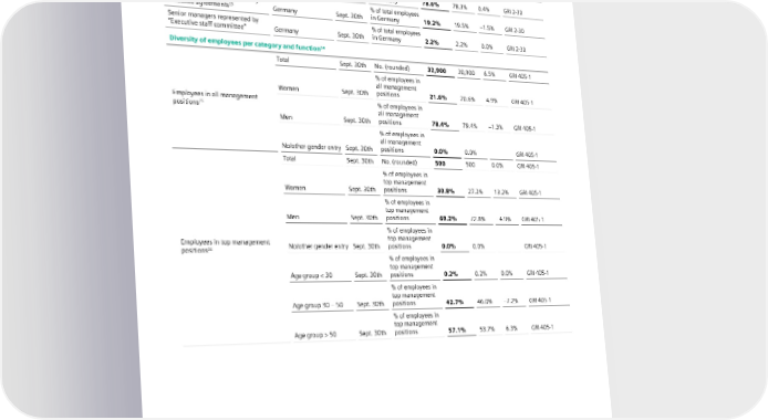 6 Our sustainability indicators Sustainability Key Performance Indicators Fiscal Year/ (KPIs) September 30th Unit FY 2023 FY 2022 +/– Standards Full-/part-time employees in headcount Full-/part-time n/a Sept. 30th No. (rounded) 900 1,600 −43.8% GRI 2-7 Employees covered by collective % of total employees bargaining agreements Germany Sept. 30th in Germany 78.6% 78.3% 0.4% GRI 2-30 Additional employees covered by % of total employees collective agreements23 Germany Sept. 30th in Germany 19.2% 19.5% –1.5% GRI 2-30 Senior managers represented by % of total employees “Executive staff committee” Germany Sept. 30th in Germany 2.2% 2.2% 0.0% GRI 2-30 Diversity of employees per category and function24 Total Sept. 30th No. (rounded) 32,900 30,900 6.5% GRI 405-1 % of employees in all management Women Sept. 30th positions 21.6% 20.6% 4.9% GRI 405-1 Employees in all management % of employees in 25 positions all management Men Sept. 30th positions 78.4% 79.4% –1.3% GRI 405-1 % of employees in all management No/other gender entry Sept. 30th positions 0.0% 0.0% GRI 405-1 Total Sept. 30th No. (rounded) 500 500 0.0% GRI 405-1 % of employees in top management Women Sept. 30th positions 30.8% 27.2% 13.2% GRI 405-1 % of employees in top management Men Sept. 30th positions 69.2% 72.8% –4.9% GRI 405-1 % of employees in Employees in top management top management positions26 No/other gender entry Sept. 30th positions 0.0% 0.0% GRI 405-1 % of employees in top management Age group < 30 Sept. 30th positions 0.2% 0.2% 0.0% GRI 405-1 % of employees in top management Age group 30 – 50 Sept. 30th positions 42.7% 46.0% –7.2% GRI 405-1 % of employees in top management Age group > 50 Sept. 30th positions 57.1% 53.7% 6.3% GRI 405-1 23 Employees not covered by collective bargaining agreements, but the organization determines their working conditions and terms of employment based on collective bargaining agreements that cover its other employees or similar agreements. 24 Diversity data only for employees, without other internal workforce and without external/third party workers. 25 Employees in all management positions with disciplinary responsibility, but without Managing Board Members. 26 Employees in top management positions with disciplinary responsibility, but without Managing Board Members. SIEMENS SUSTAINABILITY REPORT 2023 117