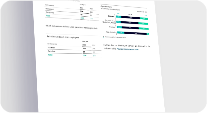 5.1 Working at Siemens Employment characteristics Changes in age distribution In fiscal 2023, 94% of our own workforce had permanent The distribution of employees by age group remained almost contracts. unchanged from the previous year. The average age in fiscal 2023 was 42 years. Permanent and temporary employees Fiscal year Age structure (in thousands) 2023 2022 (as a percentage of total employees) September 30, 2023 Permanent 300 290 < 30 30 – 50 > 50 Temporary 19 20 Siemens 16% 59% 25% Total 320 311 1 Europe, C.I.S. , 13% 56% 30% Middle East, Africa Americas 15% 53% 32% 4% of our own workforce used part-time working models. Asia, Australia 21% 71% 8% Full-time and part-time employees 1 Commonwealth of Independent States. Fiscal year (in thousands) 2023 2022 Further data on Working at Siemens are disclosed in the Full-time 305 295 indicator table. OUR SUSTAINABLITY INDICATORS Part-time 14 14 Total 320 311 SIEMENS SUSTAINABILITY REPORT 2023 88