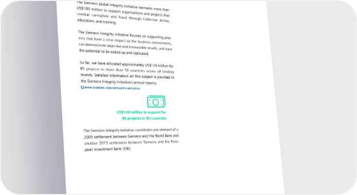 3.1 Compliance and ethics Collective Action and the Siemens Integrity Initiative We believe that in order for substantial progress to be made in combating corruption and fostering fair competition, large numbers of stakeholders must act collectively. The Siemens global Integrity Initiative earmarks more than US$100 million to support organizations and projects that combat corruption and fraud through Collective Action, education, and training. The Siemens Integrity Initiative focuses on supporting proj- ects that have a clear impact on the business environment, can demonstrate objective and measurable results, and have the potential to be scaled up and replicated. So far, we have allocated approximately US$120 million for 85 projects in more than 50 countries across all funding rounds. Detailed information on this subject is provided in the Siemens Integrity Initiative’s annual reports. WWW.SIEMENS.COM/INTEGRITYINITIATIVE US$120 million in support for 85 projects in 50 countries The Siemens Integrity Initiative constitutes one element of a 2009 settlement between Siemens and the World Bank and another 2013 settlement between Siemens and the Euro- pean Investment Bank (EIB). SIEMENS SUSTAINABILITY REPORT 2023 39