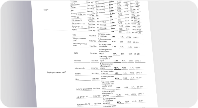 6 Our sustainability indicators Sustainability Key Performance Indicators Fiscal Year/ (KPIs) September 30th Unit FY 2023 FY 2022 +/– Standards Exits Total Fiscal Year No. (rounded) 30,400 35,800 −15.1% GRI 401-1, WEF EMEA Fiscal Year No. (rounded) 13,000 15,000 −13.3% GRI 401-1, WEF Americas Fiscal Year No. (rounded) 9,200 11,700 −21.4% GRI 401-1, WEF Asia, Australia Fiscal Year No. (rounded) 8,200 9,200 −10.9% GRI 401-1, WEF Women Fiscal Year No. (rounded) 8,500 9,500 −10.5% GRI 401-1, WEF 30 Men Fiscal Year No. (rounded) 21,800 26,100 −16.5% GRI 401-1, WEF Exits No/other gender entry Fiscal Year No. 28 10 180.0% GRI 401-1, WEF Gender n/a Fiscal Year No. 118 203 −41.9% GRI 401-1, WEF Age group < 30 Fiscal Year No. (rounded) 8,000 9,400 −14.9% GRI 401-1, WEF Age group 30 – 50 Fiscal Year No. (rounded) 14,900 18,200 −18.1% GRI 401-1, WEF Age group > 50 Fiscal Year No. (rounded) 7,400 8,000 −7.5% GRI 401-1, WEF Age n/a Fiscal Year No. 118 203 −41.9% GRI 401-1, WEF % of average number Total Fiscal Year of employees 9.6% 11.6% −17.2% GRI 401-1 Voluntary turnover % of average number rate31 Fiscal Year of employees 5.3% 6.6% −19.7% GRI 401-1 Involuntary turnover % of average number rate32 Fiscal Year of employees 4.3% 5.0% −14.0% GRI 401-1 % of average number of employees in EMEA Fiscal Year region 7.5% 8.7% −13.8% GRI 401-1 % of average number of employees in Americas Fiscal Year region 14.0% 18.6% −24.7% GRI 401-1 % of average number of employees in Asia, Australia Fiscal Year region 10.7% 12.6% −15.1% GRI 401-1 Employee turnover rate30 % of average number Women Fiscal Year of women 9.9% 11.5% −13.9% GRI 401-1 % of average number Men Fiscal Year of men 9.5% 11.6% −18.1% GRI 401-1 % of average number of employees with no/other gender No/other gender entry Fiscal Year entry 17.7% 18.0% −1.7% GRI 401-1 % of average number of employees in Age group < 30 Fiscal Year age group 16.4% 20.4% −19.6% GRI 401-1 % of average number of employees in Age group 30 – 50 Fiscal Year age group 8.0% 10.0% −20.0% GRI 401-1 % of average number of employees in Age group > 50 Fiscal Year age group 9.2% 10.1% −8.9% GRI 401-1 Employee share programs33 Employees participating in the Total (w/o SHS) Fiscal Year No. (rounded) 102,000 103,000 −1.0% Siemens employee share plans Total (w/o SHS) Fiscal Year % of total employees 43.5% 44.5% −2.2% 30 Turnover rate is defined as the ratio of voluntary and involuntary exits from Siemens during the fiscal year to the average number of employees. 31 Voluntary turnover rate is based on employee decision. 32 Involuntary turnover rate is based on other reasons, including dismissals, end of temporary contracts, mutual consent, (early) retirement, death, and other reasons that are not an employee decision. 33 Based on employees with eligibility to share plans. SIEMENS SUSTAINABILITY REPORT 2023 120