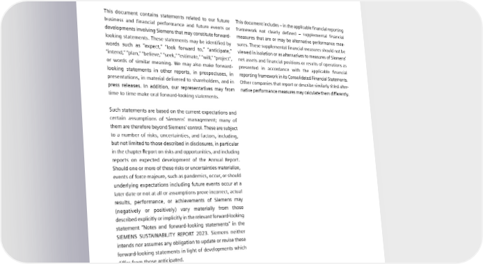 7.10 Notes and forwardlooking statements 7.10 Notes and forwardlooking statements This document contains statements related to our future This document includes – in the applicable financial reporting business and financial performance and future events or framework not clearly defined – supplemental financial developments involving Siemens that may constitute forward- measures that are or may be alternative performance mea- looking statements. These statements may be identified by sures. These supplemental financial measures should not be words such as “expect,” “look forward to,” “anticipate,” viewed in isolation or as alternatives to measures of Siemens’ “intend,” “plan,” “believe,” “seek,” “estimate,” “will,” “project”, net assets and financial positions or results of operations as or words of similar meaning. We may also make forward- presented in accordance with the applicable financial looking statements in other reports, in prospectuses, in reporting framework in its Consolidated Financial Statements. presentations, in material delivered to shareholders, and in Other companies that report or describe similarly titled alter- press releases. In addition, our representatives may from native performance measures may calculate them differently. time to time make oral forward-looking statements. Such statements are based on the current expectations and certain assumptions of Siemens’ management; many of them are therefore beyond Siemens’ control. These are subject to a number of risks, uncertainties, and factors, including, but not limited to those described in disclosures, in particular in the chapter Report on risks and opportunities, and including reports on expected development of the Annual Report. Should one or more of these risks or uncertainties materialize, events of force majeure, such as pandemics, occur, or should underlying expectations including future events occur at a later date or not at all or assumptions prove incorrect, actual results, performance, or achievements of Siemens may (negatively or positively) vary materially from those described explicitly or implicitly in the relevant forward-looking statement “Notes and forward-looking statements” in the SIEMENS SUSTAINABILITY REPORT 2023. Siemens neither intends nor assumes any obligation to update or revise these forward-looking statements in light of developments which differ from those anticipated. SIEMENS SUSTAINABILITY REPORT 2023 156