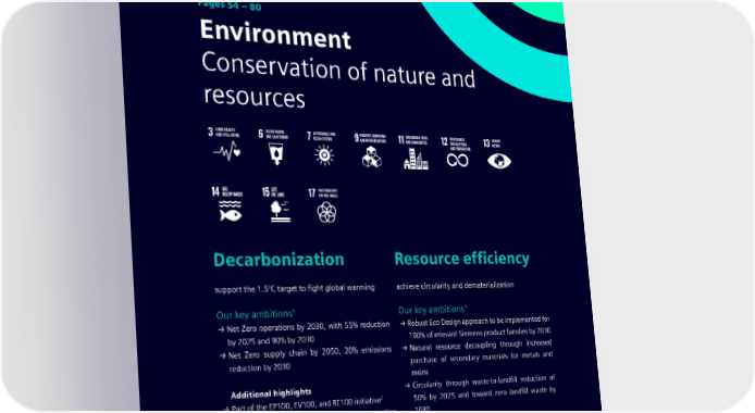 Pages 54 – 80 Environment Conservation of nature and resources Decarbonization Resource efficiency support the 1.5°C target to fight global warming achieve circularity and dematerialization 1 1 Our key ambitions Our key ambitions → Net Zero operations by 2030, with 55% reduction → Robust Eco Design approach to be implemented for by 2025 and 90% by 2030 100% of relevant Siemens product families by 2030 → Net Zero supply chain by 2050, 20% emissions → Natural resource decoupling through increased reduction by 2030 purchase of secondary materials for metals and resins Additional highlights → Circularity through waste-to-landfill reduction of 2 → Part of the EP100, EV100, and RE100 initiative 50% by 2025 and toward zero landfill waste by → Portfolio to support customers in climate protection 2030 → Disclosure of Taxonomy-eligible and Taxonomy- aligned revenues, capital expenditures, and operating Additional highlights expenditures → Assessment of our biodiversity footprint as founda- tion for further improvements → Improvements to energy efficiency as part of our Eco Efficiency @ Siemens target → Implementation of water strategy almost completed 1 Siemens without SHS. 2 Improving energy productivity (EP), use of electric vehicles (EV), and use of renewable energy (RE). SIEMENS SUSTAINABILITY REPORT 2023 54