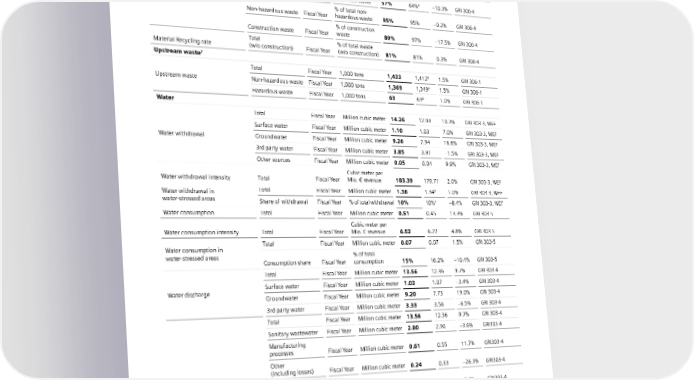 6 Our sustainability indicators Sustainability Key Performance Indicators Fiscal Year/ (KPIs) September 30th Unit FY 2023 FY 2022 +/– Standards Total % of total waste (w/o construction) Fiscal Year (w/o construction) 93% 93% −0.5% GRI 306-4 % of total Hazardous waste Fiscal Year hazardous waste 57% 64%4 −10.3% GRI 306-4 Recycling & Recovery rate % of total non- Non-hazardous waste Fiscal Year hazardous waste 95% 95% −0.2% GRI 306-4 % of construction Construction waste Fiscal Year waste 80% 97% −17.5% GRI 306-4 Total % of total waste Material Recycling rate (w/o construction) Fiscal Year (w/o construction) 81% 81% 0.3% GRI 306-4 Upstream waste7 8 Total Fiscal Year 1,000 tons 1,433 1,412 1.5% GRI 306-1 Upstream waste Non-hazardous waste Fiscal Year 1,000 tons 1,369 1,3498 1.5% GRI 306-1 Hazardous waste Fiscal Year 1,000 tons 63 638 1.0% GRI 306-1 Water Total Fiscal Year Million cubic meter 14.26 12.93 10.3% GRI 303-3, WEF Surface water Fiscal Year Million cubic meter 1.10 1.03 7.0% GRI 303-3, WEF Water withdrawal Groundwater Fiscal Year Million cubic meter 9.26 7.94 16.6% GRI 303-3, WEF 3rd party water Fiscal Year Million cubic meter 3.85 3.91 −1.5% GRI 303-3, WEF Other sources Fiscal Year Million cubic meter 0.05 0.04 9.9% GRI 303-3, WEF Cubic meter per Water withdrawal intensity Total Fiscal Year Mio. € revenue 183.39 179.71 2.0% GRI 303-3, WEF Water withdrawal in Total Fiscal Year Million cubic meter 1.36 1.344 1.0% GRI 303-3, WEF water-stressed areas Share of withdrawal Fiscal Year % of total withdrawal 10% 10%4 −8.4% GRI 303-3, WEF Water consumption Total Fiscal Year Million cubic meter 0.51 0.45 13.3% GRI 303-5 Cubic meter per Water consumption intensity Total Fiscal Year Mio. € revenue 6.52 6.22 4.8% GRI 303-5 Water consumption in Total Fiscal Year Million cubic meter 0.07 0.07 1.5% GRI 303-5 water-stressed areas % of total Consumption share Fiscal Year consumption 15% 16.2% −10.4% GRI 303-5 Total Fiscal Year Million cubic meter 13.56 12.36 9.7% GRI 303-4 Water discharge Surface water Fiscal Year Million cubic meter 1.03 1.07 −3.4% GRI 303-4 Groundwater Fiscal Year Million cubic meter 9.20 7.73 19.0% GRI 303-4 3rd party water Fiscal Year Million cubic meter 3.33 3.56 −6.5% GRI 303-4 Total Fiscal Year Million cubic meter 13.56 12.36 9.7% GRI 303-4 Sanitary wastewater Fiscal Year Million cubic meter 2.80 2.90 −3.6% GRI303-4 Manufacturing processes Fiscal Year Million cubic meter 0.61 0.55 11.7% GRI303-4 Other Discharge usage (including losses) Fiscal Year Million cubic meter 0.24 0.33 −26.3% GRI303-4 Cooling water dis- charged as wastewater Fiscal Year Million cubic meter 0.14 0.13 5.2% GRI303-4 Chemically unchanged cooling water (returned to receiving water body chemically unchanged, but warmed) Fiscal Year Million cubic meter 9.80 8.49 15.5% GRI303-4 4 Change in last year data caused by subsequent adjustment. 7 Analysis of our supply chain based on purchase data by using of a macroeconomic input-output-model also adjusted for inflation. 8 Change in last year data caused by new calculation method. SIEMENS SUSTAINABILITY REPORT 2023 113