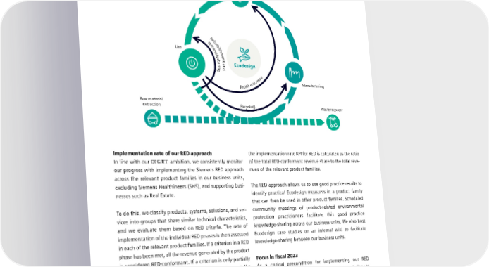 4.3 Product stewardship Siemens’ vision of an almost completely closed lifecycle when applying our RED approach Production Re r fu em rb Use an ishm u fa en c tu t r a gni dn Ecodesign e s eu r Manufacturing and ir a p e R Raw material R e g c lin y extraction c Waste recovery Implementation rate of our RED approach the implementation rate KPI for RED is calculated as the ratio In line with our DEGREE ambition, we consistently monitor of the total RED-conformant revenue share to the total reve- our progress with implementing the Siemens RED approach nues of the relevant product families. across the relevant product families in our business units, excluding Siemens Healthineers (SHS), and supporting busi- The RED approach allows us to use good practice results to nesses such as Real Estate. identify practical Ecodesign measures in a product family that can then be used in other product families. Scheduled To do this, we classify products, systems, solutions, and ser- community meetings of product-related environmental vices into groups that share similar technical characteristics, protection practitioners facilitate this good practice and we evaluate them based on RED criteria. The rate of knowledge-sharing across our business units. We also host implementation of the individual RED phases is then assessed Ecodesign case studies on an internal wiki to facilitate in each of the relevant product families. If a criterion in a RED knowledge-sharing between our business units. phase has been met, all the revenue generated by the product is considered RED-conformant. If a criterion is only partially Focus in fiscal 2023 met, 25% of the revenue is considered RED-conformant. If a As a critical precondition for implementing our RED criterion is not met, the corresponding revenue is disregarded. approach, we worked on developing automated solutions to calculate LCAs and generate EPDs in fiscal 2023. This aims to The RED implementation rate for each product family is then facilitate Ecodesign comparisons and the systematic use of determined by averaging the fulfillment levels of the individual LCAs and EPDs at Siemens. We also published an INTERNAL RED criteria. We calculate the revenue share of our RED-con- ON ECODESIGN to ensure alignment, increase transparency, and formant portfolio by multiplying the RED implementation accelerate knowledge generation on Ecodesign. rate with the revenues of the given product families. Lastly, SIEMENS SUSTAINABILITY REPORT 2023 74