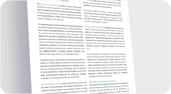 4.4 EU taxonomy The EU Taxonomy’s current eligibility rules for reporting on Siemens Mobility enables transportation operators around climate change mitigation and adaption cover the Digital the world to make their trains and infrastructure smart and Industries portfolio to a limited extent only. With the appli- electrified, and contributes to efficient, low-carbon transpor- cation of the four new environmental objectives for fiscal tation. Leveraging the advantages of digitalization, it helps 2024 and amendments to existing objectives, an increased increase sustainable value creation throughout the entire coverage of business activities is expected. lifecycle, improve passenger comfort, deliver 100% system availability, and maximize network capacity. The Smart Infrastructure (SI) portfolio includes a wide range of products, services, solutions, and software for all aspects The Siemens Mobility portfolio is almost fully eligible, of grid management, electrical products, building automation, contributing to climate change mitigation through manufac- fire protection and security, e-mobility charging infrastructure, turing of low-carbon technologies for transportation, and and energy efficiency. It offers smart connections for energy - providing infrastructure for rail transportation and infra systems, buildings, and industries. structure enabling public transport. An important portion of this portfolio is devoted to integrating Siemens Healthineers (SHS) is a global provider of healthcare renewable energy into the power grid, increasing electromo- products, solutions, and services with holistic system com- bility, enhancing energy efficiency in buildings, and making petence. The portfolio serves clinical decision-making and the measurement of infrastructure more transparent using treatment pathways definition – from in vitro and in vivo digital tools and data management solutions. Smart Infra- diagnostics to image-guided therapy and innovative cancer structure contributes to electrification with a broad portfolio treatment. The comprehensive portfolio supports customers of low- and medium-voltage power distribution and electrical along the entire care continuum, from prevention and early installation equipment. The Smart Infrastructure portfolio detection through to diagnosis, treatment, and follow-up supports driving decarbonization, resource efficiency, and care. the people-centricity of energy systems, buildings, and industries by connecting the real and digital worlds. Siemens Healthineers concluded in its analysis of contributing activities, that the current climate-related objectives are not A material portion of the Smart Infrastructure portfolio is applicable to manufacturing of medical products, which is eligible for climate objective-related EU Taxonomy reporting, Siemens Healthineers’ primary activity. Taxonomy-relevant especially energy-efficient equipment for buildings and ser- capital expenditures are for the most part reported under vices for energy performance of buildings. With the addition selected economic activities referring to construction and of more activities for climate change mitigation and for the real estate. With the release of the four new environmental other environmental objectives, we expect an increased objectives, Siemens Healthineers expects an increased coverage of our business activities for fiscal 2024. coverage of its economic activities. Siemens Mobility (SMO) combines all Siemens businesses in Eligibility assessment at Siemens the area of rail passenger and freight transportation. The The purpose of the eligibility assessment is to determine if portfolio includes products and solutions related to rolling Siemens’ business activities fit the description of one of the stock (like trains and locomotives), rail infrastructure (includ- economic activities specified by the EU Taxonomy. If a ing rail automation and electrification), and the service Siemens business activity matches, it is then classified as business, e.g., maintenance and digital services. Its offerings “eligible”. A business activity that is “non-eligible” is not comprise software solutions, like train planning systems, within the scope of the EU Taxonomy reporting. The eligibility Mobility-as-a-Service (Maas), reservation management and assessments were conducted decentrally in the businesses in ticketing, and a turnkey business that bundles consulting, an interdisciplinary manner involving experts, for instance planning, financing, constructing, servicing, and operating from technical, strategy, or sustainability departments. of complete mobility systems. SIEMENS SUSTAINABILITY REPORT 2023 77