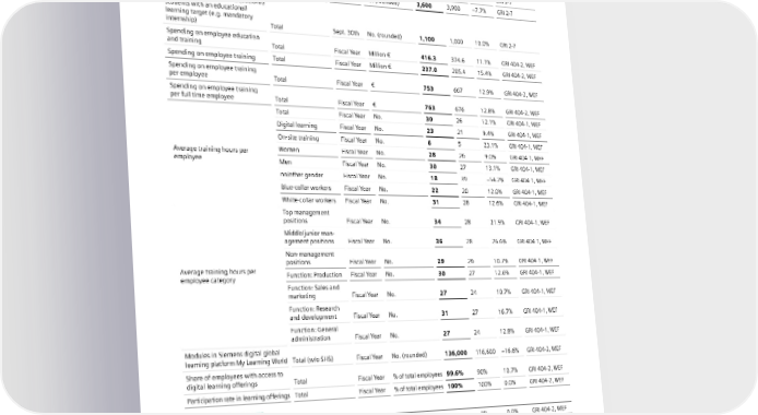 6 Our sustainability indicators Sustainability Key Performance Indicators Fiscal Year/ (KPIs) September 30th Unit FY 2023 FY 2022 +/– Standards Professional education and lifelong learning Apprentices and dual students Total Sept. 30th No. (rounded) 5,800 5,500 5.5% GRI 2-7 Germany Sept. 30th No. (rounded) 3,600 3,900 −7.7% GRI 2-7 Average number of interns/(doctoral) students with an educational/ learning target (e.g. mandatory internship) Total Sept. 30th No. (rounded) 1,100 1,000 10.0% GRI 2-7 Spending on employee education and training Total Fiscal Year Million € 416.3 374.6 11.1% GRI 404-2, WEF Spending on employee training Total Fiscal Year Million € 237.0 205.4 15.4% GRI 404-2, WEF Spending on employee training per employee Total Fiscal Year € 753 667 12.9% GRI 404-2, WEF Spending on employee training per full time employee Total Fiscal Year € 763 676 12.8% GRI 404-2, WEF Total Fiscal Year No. 30 26 12.1% GRI 404-1, WEF Digital learning Fiscal Year No. 23 21 9.4% GRI 404-1, WEF On-site training Fiscal Year No. 6 5 23.1% GRI 404-1, WEF Average training hours per Women Fiscal Year No. 28 26 9.0% GRI 404-1, WEF employee Men Fiscal Year No. 30 27 13.1% GRI 404-1, WEF no/other gender Fiscal Year No. 18 39 −54.2% GRI 404-1, WEF Blue-collar workers Fiscal Year No. 22 20 12.0% GRI 404-1, WEF White-collar workers Fiscal Year No. 31 28 12.6% GRI 404-1, WEF Top management positions Fiscal Year No. 34 28 21.5% GRI 404-1, WEF Middle/junior man- agement positions Fiscal Year No. 36 28 26.6% GRI 404-1, WEF Non-management positions Fiscal Year No. 29 26 10.7% GRI 404-1, WEF Average training hours per Function: Production Fiscal Year No. 30 27 12.6% GRI 404-1, WEF employee category Function: Sales and marketing Fiscal Year No. 27 24 10.7% GRI 404-1, WEF Function: Research and development Fiscal Year No. 31 27 16.7% GRI 404-1, WEF Function: General administration Fiscal Year No. 27 24 12.8% GRI 404-1, WEF Modules in Siemens digital global learning platform My Learning World Total (w/o SHS) Fiscal Year No. (rounded) 136,000 116,600 –16.6% GRI 404-2, WEF Share of employees with access to digital learning offerings Total Fiscal Year % of total employees 99.6% 90% 10.7% GRI 404-2, WEF Participation rate in learning offerings Total Fiscal Year % of total employees 100% 100% 0.0% GRI 404-2, WEF Development programs Siemens Core Learning Paths (CLP) Total Fiscal Year No. 29 29 0.0% GRI 404-2, WEF Siemens Potential Development Programs (PDP) Total (w/o SHS) Fiscal Year No. 38 36 5.6% GRI 404-2, WEF Xcelerate Your Potential @ Siemens Total community Sept. 30th No. 23 22 4.5% GRI 404-2, WEF (XPS) Active participants (w/o SHS) Sept. 30th No. 3 2 50.0% GRI 404-2, WEF Siemens Finance Excellence Total community Sept. 30th No. 69 68 1.5% GRI 404-2, WEF Program (FEP) Active participants Sept. 30th No. 8 9 –11.1% GRI 404-2, WEF SIEMENS SUSTAINABILITY REPORT 2023 121