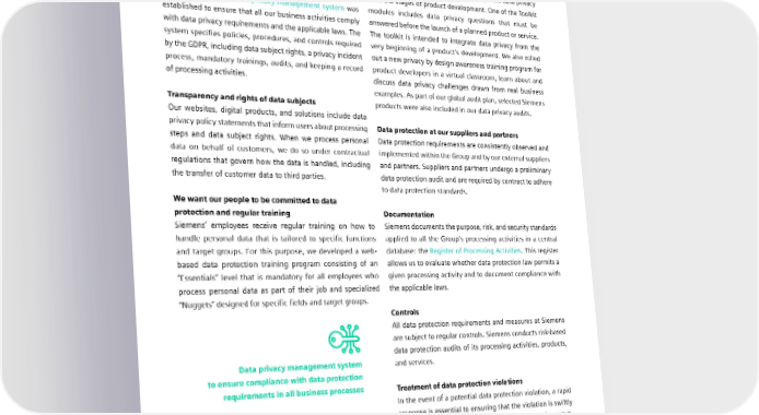 3.4 Cybersecurity and data privacy Actions and results Assessing and fostering our privacy by design processes was a key focus area in fiscal 2023. Privacy by design at Siemens Siemens’ data privacy management system is supported by our Privacy by Design Toolkit, a software To put our data privacy measures into action throughout the solution that helps process owners incorporate data privacy Group, Siemens has made them an integral part of our com- in all the stages of product development. One of the Toolkit pliance system. Our data privacy management system was modules includes data privacy questions that must be established to ensure that all our business activities comply answered before the launch of a planned product or service. with data privacy requirements and the applicable laws. The The toolkit is intended to integrate data privacy from the system specifies policies, procedures, and controls required very beginning of a product’s development. We also rolled by the GDPR, including data subject rights, a privacy incident out a new privacy by design awareness training program for process, mandatory trainings, audits, and keeping a record product developers in a virtual classroom, learn about and of processing activities. discuss data privacy challenges drawn from real business examples. As part of our global audit plan, selected Siemens Transparency and rights of data subjects products were also included in our data privacy audits. Our websites, digital products, and solutions include data privacy policy statements that inform users about processing Data protection at our suppliers and partners steps and data subject rights. When we process personal Data protection requirements are consistently observed and data on behalf of customers, we do so under contractual implemented within the Group and by our external suppliers regulations that govern how the data is handled, including and partners. Suppliers and partners undergo a preliminary the transfer of customer data to third parties. data protection audit and are required by contract to adhere to data protection standards. We want our people to be committed to data protection and regular training Documentation Siemens’ employees receive regular training on how to Siemens documents the purpose, risk, and security standards handle personal data that is tailored to specific functions applied to all the Group’s processing activities in a central and target groups. For this purpose, we developed a web- database: the Register of Processing Activities. This register based data protection training program consisting of an allows us to evaluate whether data protection law permits a “Essentials” level that is mandatory for all employees who given processing activity and to document compliance with process personal data as part of their job and specialized the applicable laws. “Nuggets” designed for specific fields and target groups. Controls All data protection requirements and measures at Siemens are subject to regular controls. Siemens conducts risk-based data protection audits of its processing activities, products, Data privacy management system and services. to ensure compliance with data protection requirements in all business processes Treatment of data protection violations In the event of a potential data protection violation, a rapid Data protection in our products and solutions response is essential to ensuring that the violation is swiftly (privacy by design) stopped and corrected. To facilitate this, Siemens has estab- Siemens wants to ensure that its products and solutions can be lished a global Data Privacy Incident Process that uses central used in compliance with all relevant data protection rules. At reporting channels and aims to immediately inform all Siemens, privacy by design means that compliance with the internal and external stakeholders (including the data law, transparency, informational self-determination, data subjects and regulatory authorities). minimization, and data security are already applied when products and services are developed. Therefore, privacy by design is integrated into our product development processes. SIEMENS SUSTAINABILITY REPORT 2023 53