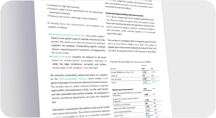3.3 Sustainable supply chain practices The supplier management process at Siemens incorporates Self-assessments and site audits as control strict criteria for supplier selection and qualification. When mechanisms engaging with new suppliers, we categorize and if necessary Based on the risk categories, we conduct appropriate evalu- proactively address potential sustainability risks based on ations of suppliers in accordance with our risk assessment. these criteria. This may apply to suppliers exhibiting the These reviews range from supplier self-assessments of their following risk characteristics: own sustainability practices to on-site sustainability audits conducted by external auditors. → Locations in high-risk countries → Products subject to the requirements for the responsible Corporate Responsibility SelfAssessments sourcing of minerals CRSAs are an integral part of our supplier qualification pro- → Products and services with large carbon footprints cess. They are subject to regular review and updates to align them with evolving standards and regulations. As part of this To identify these risk characteristics, we categorize our process, potential suppliers undergo a mandatory qualifica- suppliers as follows: tion procedure, while existing suppliers are re-assessed every three years. → Purchased material and service fields: We classify suppliers based on the specific types of materials and services they The number of completed CRSAs increased by about 4% from provide. This allows us to tailor our measures to individual 4,912 in fiscal 2022 to 5,096 in fiscal 2023. The number of suppliers: for example, incorporating specific contract agreed-upon improvement measures increased in fiscal 2023 clauses, requesting proof of compliance, or flagging them to 5,493, as compared to the 3,109 reported in fiscal 2022. for on-site audits. → Country risk levels: Suppliers are assigned to risk levels based on country-specific sustainability indicators in Corporate Responsibility Self-Assessments (CRSA)¹ areas like legal compliance, corruption and bribery, Fiscal year human rights in the workplace, and child labor. (Number) 2023 2022 Europe, Middle East, Africa, C.I.S.² 1,122 1,147 We centralize sustainability-related data about our suppliers Americas 767 654 on the SCM Sustainability Platform, which enables us to Asia, Australia 3,207 3,111 gather information from diverse internal and external sources. Total 5,096 4,912 This includes data on carbon reduction initiatives, corporate responsibility self-assessments (CRSA), on-site audit results, Agreed upon improvement³ 2023 2022 and risks associated with conflict minerals. All employees in Legal Compliance/prohibition of corruption Siemens’ purchasing departments can access this integrated and bribery 1,698 915 tool. Respect for the basic human rights of employees 1,194 564 Information is evaluated in the platform using a point system Prohibition of child labor 168 80 and is presented visually. This uniform assessment approach Health and safety of employees 1,103 879 enables sustainability to serve as a consistent evaluation Environmental protection 1,116 546 factor throughout Siemens. It supports and complements Supply chain 214 125 local purchasing decisions with globally available supplier Total 5,493 3,109 sustainability information. 1 Self-assessments completed mainly by suppliers from non-OECD countries with a purchasing volume of > €50,000 per year. Questionnaires that were initiated, completed, and concluded in the reporting period. 2 Commonwealth of Independent States. 3 Improvement measures agreed on with suppliers relate either to actual deviations from the Supplier Code of Conduct, structural improvements in management systems, or a lack of specific processes and guidelines implemented by the supplier. SIEMENS SUSTAINABILITY REPORT 2023 46