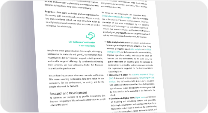 1.2 Company profile Siemens’ systematic evaluation draws from customer satisfac- Innovation strengthens Siemens and its tion surveys conducted annually worldwide. The score itself customers is based on a single question: “How likely is it that you would Our Research and Development (R&D) activities are geared recommend Siemens to a colleague or business partner?” towards developing innovative and sustainable solutions for Siemens’ customers and businesses, while simultaneously The survey pursues a holistic approach to customer relations strengthening our competitive positioning. This is also how because it follows up by implementing processes and systems we contribute to society. 4 designed to help foster long-term customer loyalty. We focus on core technologies and innovation fields – Regardless of the score, we initiate a follow-up process after Siemens Company Core Technologies – that play an essential the survey, both internally and externally. When a score is role in the success of Siemens and its customers. The imple- low and considered critical, we take immediate action to mentation of our core technologies by our operating identify key issues and determine what measures are needed businesses and Technology – our central R&D department – to improve the relationship. ensures that research activities and business strategies are closely aligned, and that all businesses can profit equally and quickly from technological developments. For example: Our customers’ satisfaction → Data Analytics & AI: Industrial facilities and infrastruc- is our top priority tures are generating ever-growing amounts of data. Using methods of machine-based data analysis and artificial Despite the tense global situation (for example, with supply intelligence (AI), we help operators increase availability, bottlenecks for materials and goods), our customers have improve operational quality, and reduce the stress on recognized us for our customer support, reliable products, humans and the environment. At the same time, our and a wide range of offerings. By consistently addressing quality statement on industrial-grade AI expresses its their concerns, we have achieved a higher Net Promoter trustworthiness, reliability, and robustness according to Score than the previous year. the requirements suggested for the European Union’s upcoming AI Act. We are focusing on areas where we can make a difference. → Connectivity & Edge: The Industrial Internet of Things This means creating sustainable, long-term value for our (IIoT) is the result of the increasing networking of field customers, for the environment, for society, and for the devices. The IIoT enables field devices to be equipped people who work for Siemens. with additional software-based functions during ongoing operations and makes it possible for the data generated Research and Development by these devices to be evaluated in the field or in the At Siemens our purpose is to provide innovations that cloud. improve the quality of life and create added value for people → Simulation & Digital Twin: Digital twins are the result all over the world. of modeling and simulating systems and processes, including the development and manufacturing of products. Digital twins make it easier to accelerate the commissioning of manufacturing plants, speed up time-to-market, and improve the operation of infrastructures throughout their lifecycles. 4 In most cases, the survey questions are focused on the business unit level. However, the overall score can be aggregated up to the business level and to the level of the entire company. SIEMENS SUSTAINABILITY REPORT 2023 13