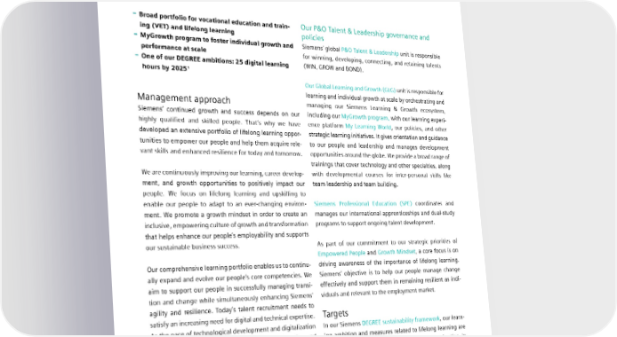 5.3 Professional education and lifelong learning 5.3 Professional education and lifelong learning – Broad portfolio for vocational education and train Our P&O Talent & Leadership governance and ing (VET) and lifelong learning policies – MyGrowth program to foster individual growth and Siemens’ global P&O Talent & Leadership unit is responsible performance at scale for winning, developing, connecting, and retaining talents – One of our DEGREE ambitions: 25 digital learning (WIN, GROW and BOND). 1 hours by 2025 Our Global Learning and Growth (GLG) unit is responsible for learning and individual growth at scale by orchestrating and Management approach managing our Siemens Learning & Growth ecosystem, Siemens’ continued growth and success depends on our including our MyGrowth program, with our learning experi- highly qualified and skilled people. That’s why we have ence platform My Learning World, our policies, and other developed an extensive portfolio of lifelong learning oppor- strategic learning initiatives. It gives orientation and guidance tunities to empower our people and help them acquire rele- to our people and leadership and manages development vant skills and enhanced resilience for today and tomorrow. opportunities around the globe. We provide a broad range of trainings that cover technology and other specialties, along We are continuously improving our learning, career develop- with developmental courses for inter-personal skills like ment, and growth opportunities to positively impact our team leadership and team building. people. We focus on lifelong learning and upskilling to - Siemens Professional Education (SPE) coordinates and enable our people to adapt to an ever-changing environ ment. We promote a growth mindset in order to create an manages our international apprenticeships and dual-study inclusive, empowering culture of growth and transformation programs to support ongoing talent development. that helps enhance our people’s employability and supports our sustainable business success. As part of our commitment to our strategic priorities of Empowered People and Growth Mindset, a core focus is on Our comprehensive learning portfolio enables us to continu- driving awareness of the importance of lifelong learning. ally expand and evolve our people’s core competencies. We Siemens’ objective is to help our people manage change aim to support our people in successfully managing transi- effectively and support them in remaining resilient as indi- tion and change while simultaneously enhancing Siemens’ viduals and relevant to the employment market. agility and resilience. Today’s talent recruitment needs to satisfy an increasing need for digital and technical expertise. Targets As the pace of technological development and digitalization In our Siemens DEGREE sustainability framework, our learn- reduces the half-life of expertise, continuous learning and ing ambition and measures related to lifelong learning are upskilling is fundamental to Siemens’ continuing success. embedded in Employability, one of the six fields of action, in order to encourage our people’s resilience.1 Our ongoing investments in vocational education and train- ing (VET) and talent-entry programs also help us attract and retain talents. 1 Siemens without SHS. SIEMENS SUSTAINABILITY REPORT 2023 93