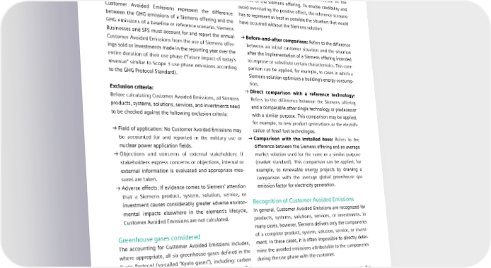 7.2 Reporting principles for Customer Avoided Emissions Accounting for Customer Avoided Emissions Baseline methodology All Siemens Businesses and SFS are required to report the The baseline methodology defined in the guideline refers to Customer Avoided Emissions for all products, systems, solu- the comparison of a Siemens product, system, solution, tions, services, or investments that lead to the avoidance of service, or investment with a reference situation in the GHG emissions during the customer use phase. absence of the Siemens offering. To enable credibility and avoid overstating the positive effect, the reference scenario Customer Avoided Emissions represent the difference has to represent as best as possible the situation that would between the GHG emissions of a Siemens offering and the have occurred without the Siemens solution. GHG emissions of a baseline or reference scenario. Siemens Businesses and SFS must account for and report the annual → Beforeandafter comparison: Refers to the difference Customer Avoided Emissions from the use of Siemens offer- between an initial customer situation and the situation ings sold or investments made in the reporting year over the after the implementation of a Siemens offering intended entire duration of their use phase (“future impact of today’s to improve or substitute certain characteristics. This com- revenue” similar to Scope 3 use phase emissions according parison can be applied, for example, to cases in which a to the GHG Protocol Standard). Siemens solution optimizes a building’s energy consump- tion. Exclusion criteria: → Direct comparison with a reference technology: Before calculating Customer Avoided Emissions, all Siemens Refers to the difference between the Siemens offering products, systems, solutions, services, and investments need and a comparable other single technology or predecessor to be checked against the following exclusion criteria: with a similar purpose. This comparison may be applied, for example, to new product generations or the electrifi- → Field of application: No Customer Avoided Emissions may cation of fossil fuel technologies. be accounted for and reported in the military use or → Comparison with the installed base: Refers to the nuclear power application fields. difference between the Siemens offering and an average → Objections and concerns of external stakeholders: If market solution used for the same or a similar purpose stakeholders express concerns or objections, internal or (market standard). This comparison can be applied, for - external information is evaluated and appropriate mea example, to renewable energy projects by drawing a sures are taken. comparison with the average global greenhouse gas → Adverse effects: If evidence comes to Siemens’ attention emission factor for electricity generation. that a Siemens product, system, solution, service, or investment causes considerably greater adverse environ- Recognition of Customer Avoided Emissions mental impacts elsewhere in the element’s lifecycle, In general, Customer Avoided Emissions are recognized for Customer Avoided Emissions are not calculated. products, systems, solutions, services, or investments. In many cases, however, Siemens delivers only the components Greenhouse gases considered of a complete product, system, solution, service, or invest- The accounting for Customer Avoided Emissions includes, ment. In these cases, it is often impossible to directly deter- where appropriate, all six greenhouse gases defined in the mine the avoided emissions attributable to the components Kyoto Protocol (so-called “Kyoto gases”), including: carbon during the use phase with the customer. dioxide (CO2), methane (CH4), nitrous oxide (N2O), sulfur hexafluoride (SF ), hydrofluorocarbons (HFCs), and perfluo- Therefore, Siemens Businesses and SFS need to apply the 6 rocarbons (PFCs). following rules when accounting for and reporting Customer Avoided Emissions: To assess the relevance of GHG emissions other than CO2, they are converted into metric tons of CO equivalents → Siemens supplies the entire product, system, solution, 2 (CO2e). This number is based on the global warming potential service, or investment: Siemens accounts for 100% of the over 100 years of the respective greenhouse gas compared Customer Avoided Emissions during the customer use to the global warming potential of CO . phase. 2 SIEMENS SUSTAINABILITY REPORT 2023 129